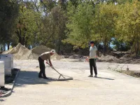 Специалисты подрядчика на уже уложенную плитку разбрасывают песок для того, чтобы заполнить им прогалины для лучшей ее устойчивости.
