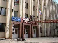 Вывеску под названием "Администрация г. Бердянска Запорожская область" на керченской Школе имени Романа Сердюка устанавливают во второй раз.