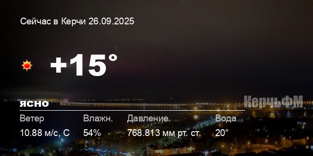 Сегодня днем в Керчи, 26 сентября, ожидается ясная погода, температура воздуха от +14.7° до +15.9°С, ветер северный 10.88 м/с, порывы до 12.47 м/с, давление 769.6 мм рт. ст., влажность 58%.