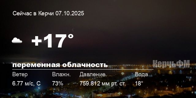 Сегодня днем в Керчи, 07 октября, ожидается пасмурная погода, температура воздуха от +15.6° до +18.7°С, ветер северный 6.32 м/с, порывы до 7.58 м/с, давление 758.3 мм рт. ст., влажность 72%.