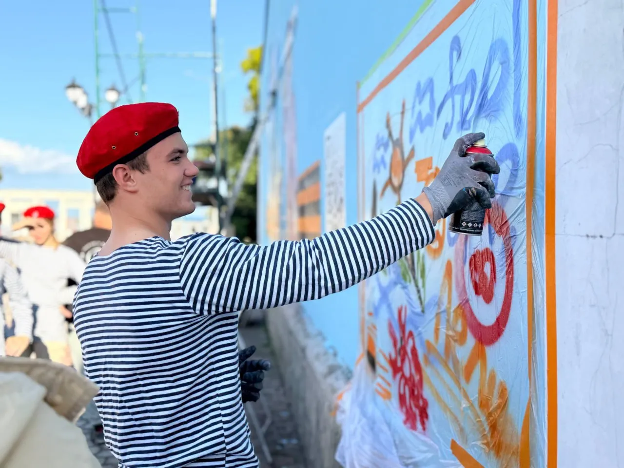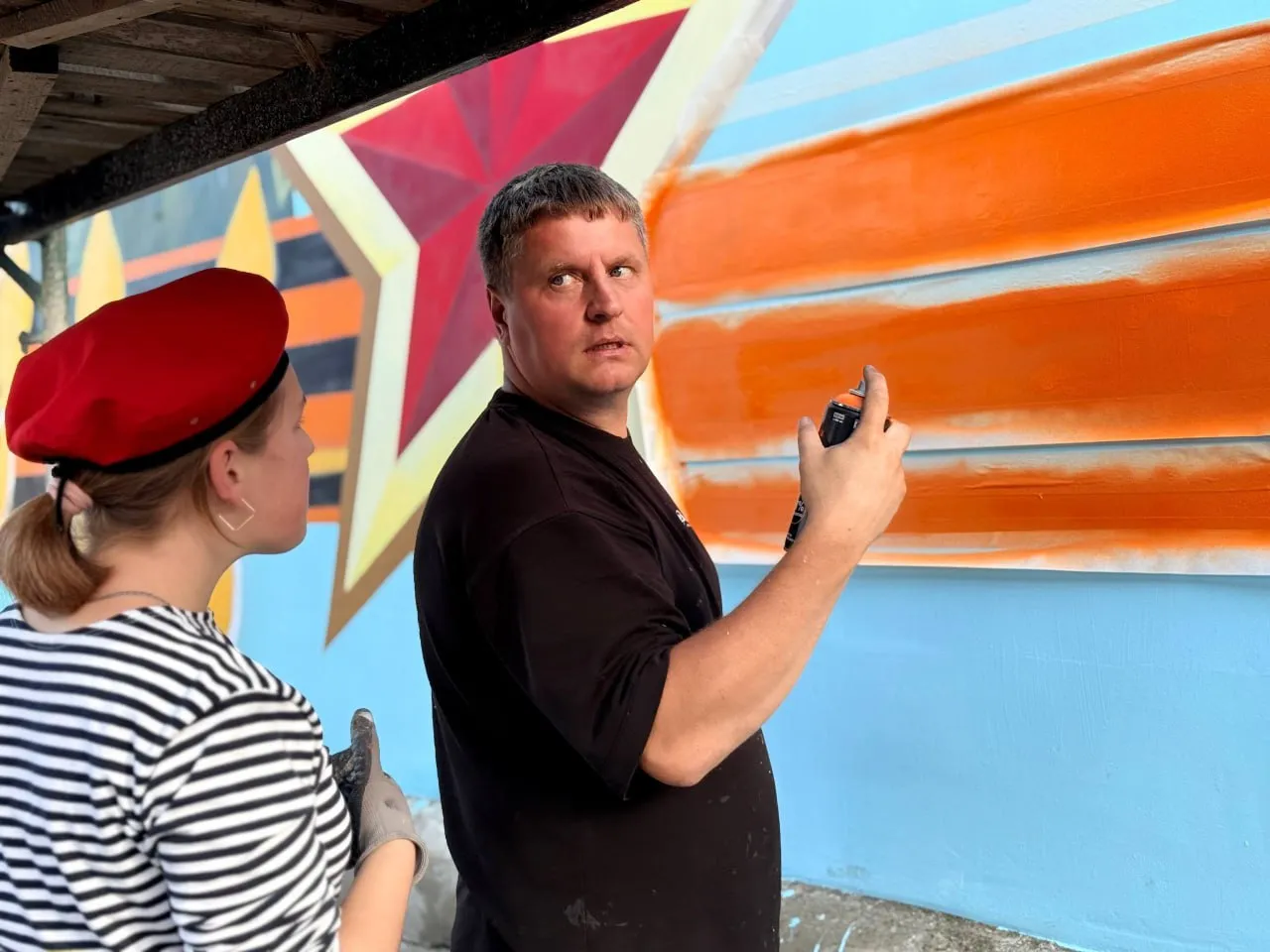 Создают новый мурал московский художник вместе с представителями местного отделения «ЮНАРМИЯ».