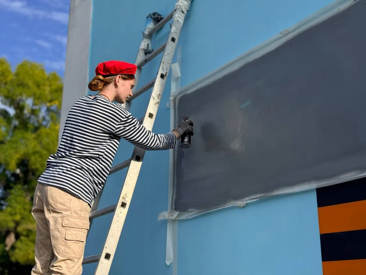 На стене в районе сквера Славы изображают портреты участника СВО и одного из юнармейцев города, принимающего активное участие в мероприятиях, имеющего достижения и награды.