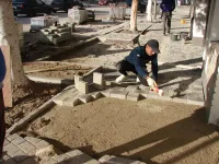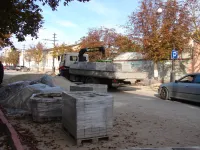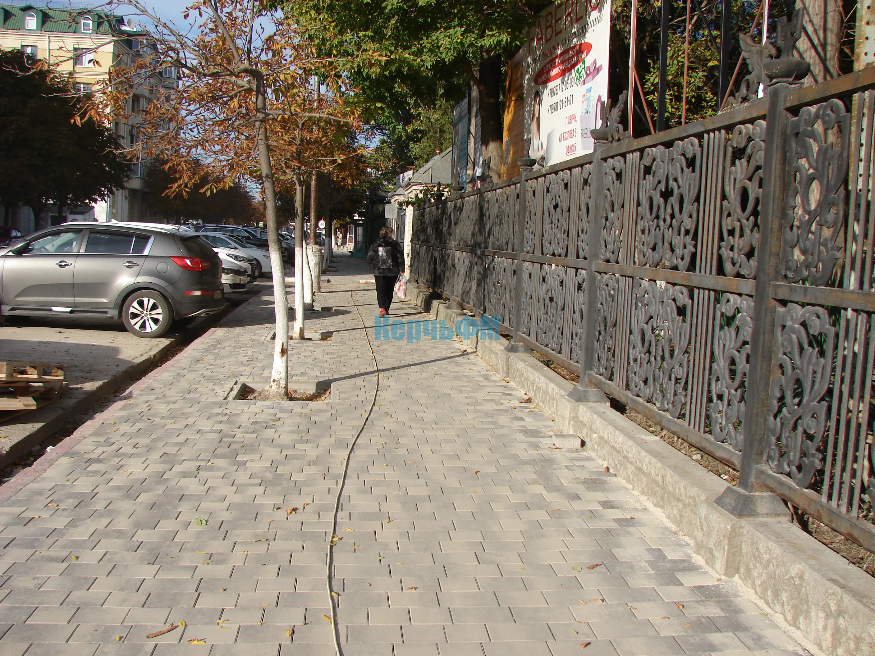 Тротуарная плитка демонтирована полностью и пешеходные дорожки обнесены новым поребриком.