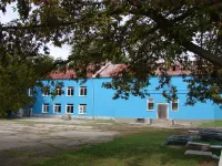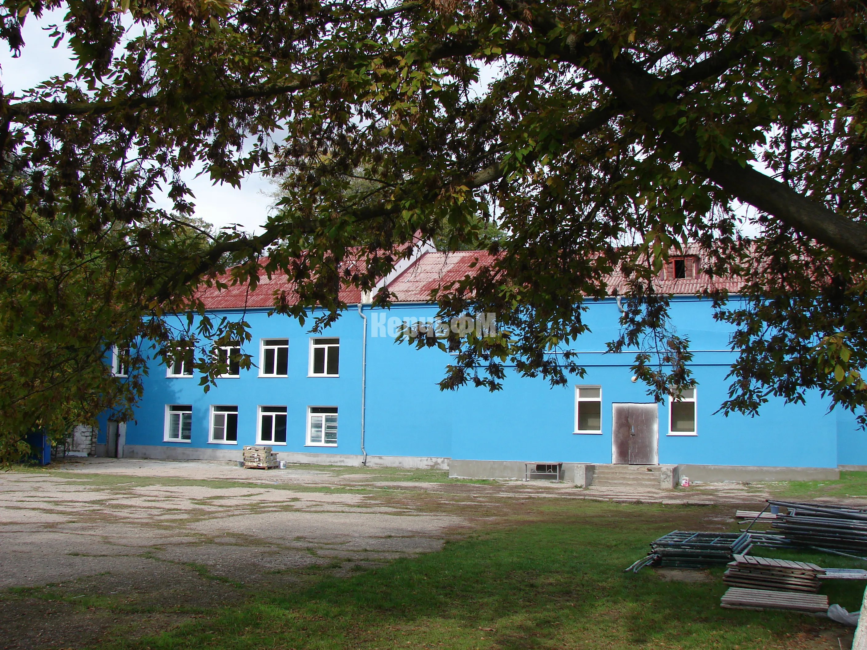 Тон синего оттенка немного отличается от того, в который был покрашен отдельно стоящий спортивный зал.