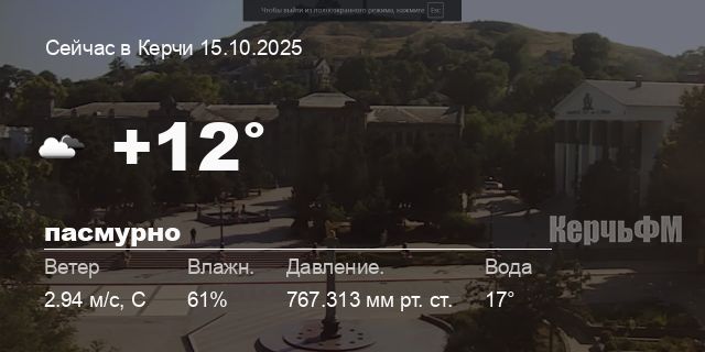Сегодня днем в Керчи, 15 октября, ожидается пасмурная погода, температура воздуха от +10.9° до +13.1°С, ветер 3.44 м/с, порывы до 4 м/с, давление 766.6 мм рт. ст., влажность 53%.