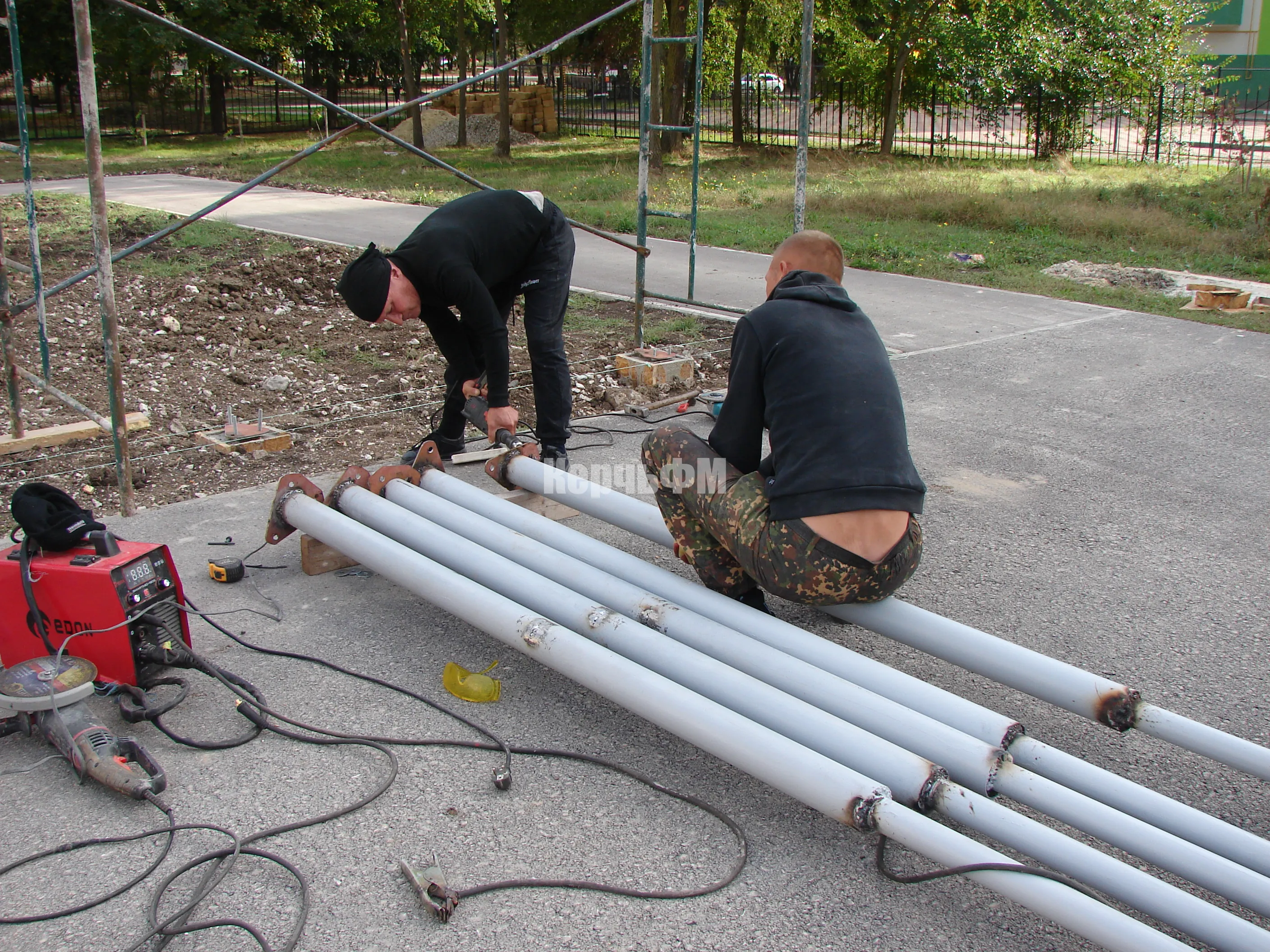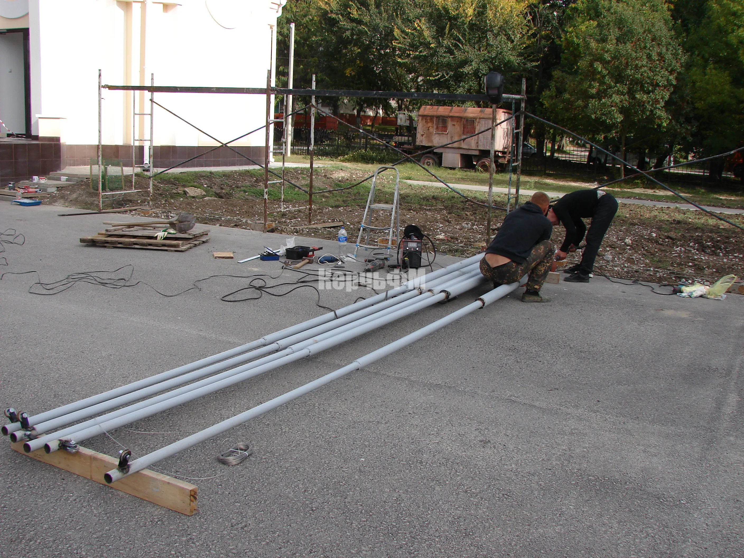Рядом на территории мастера готовят флагштоки, которые установят справа от входа.