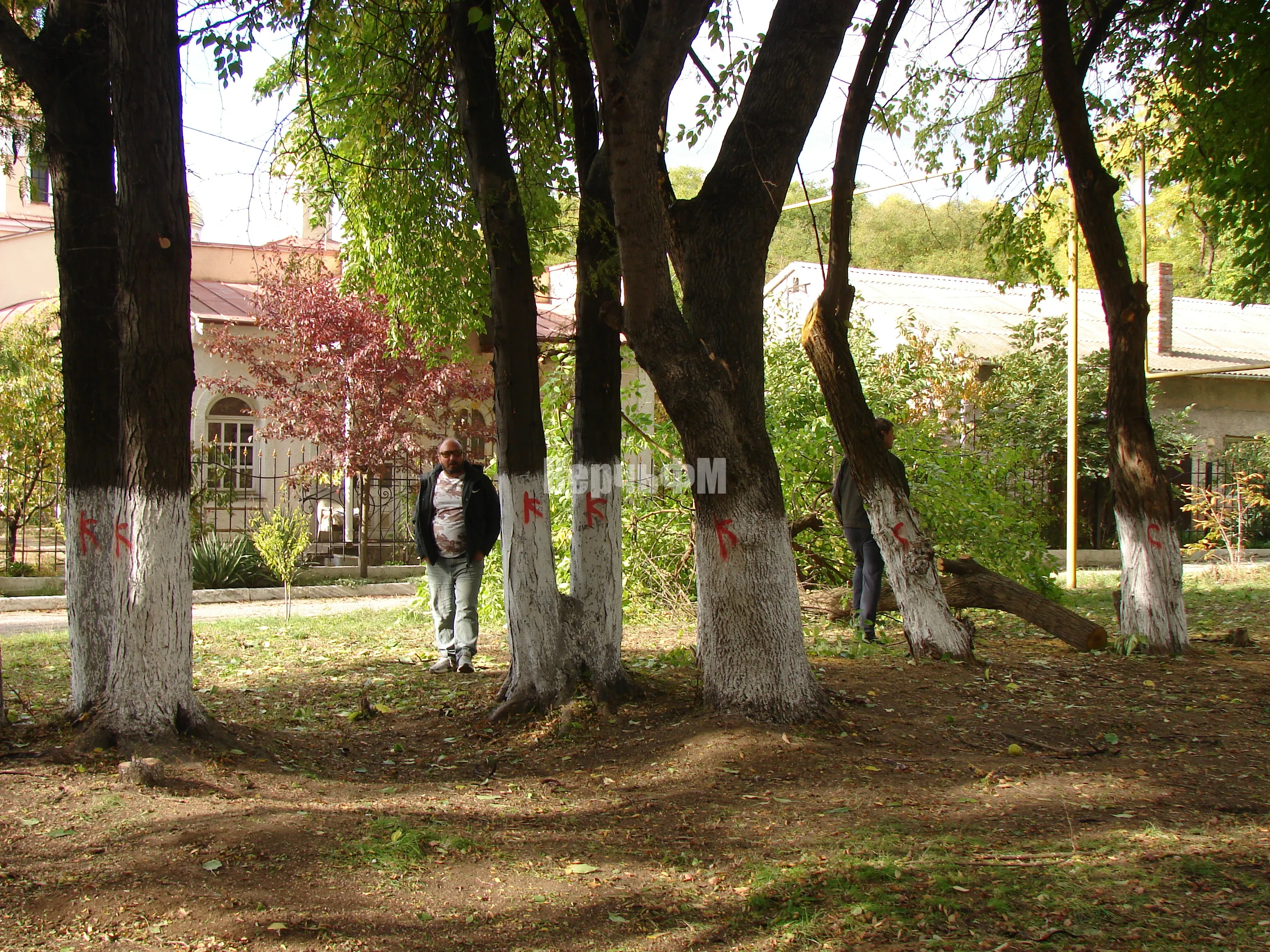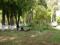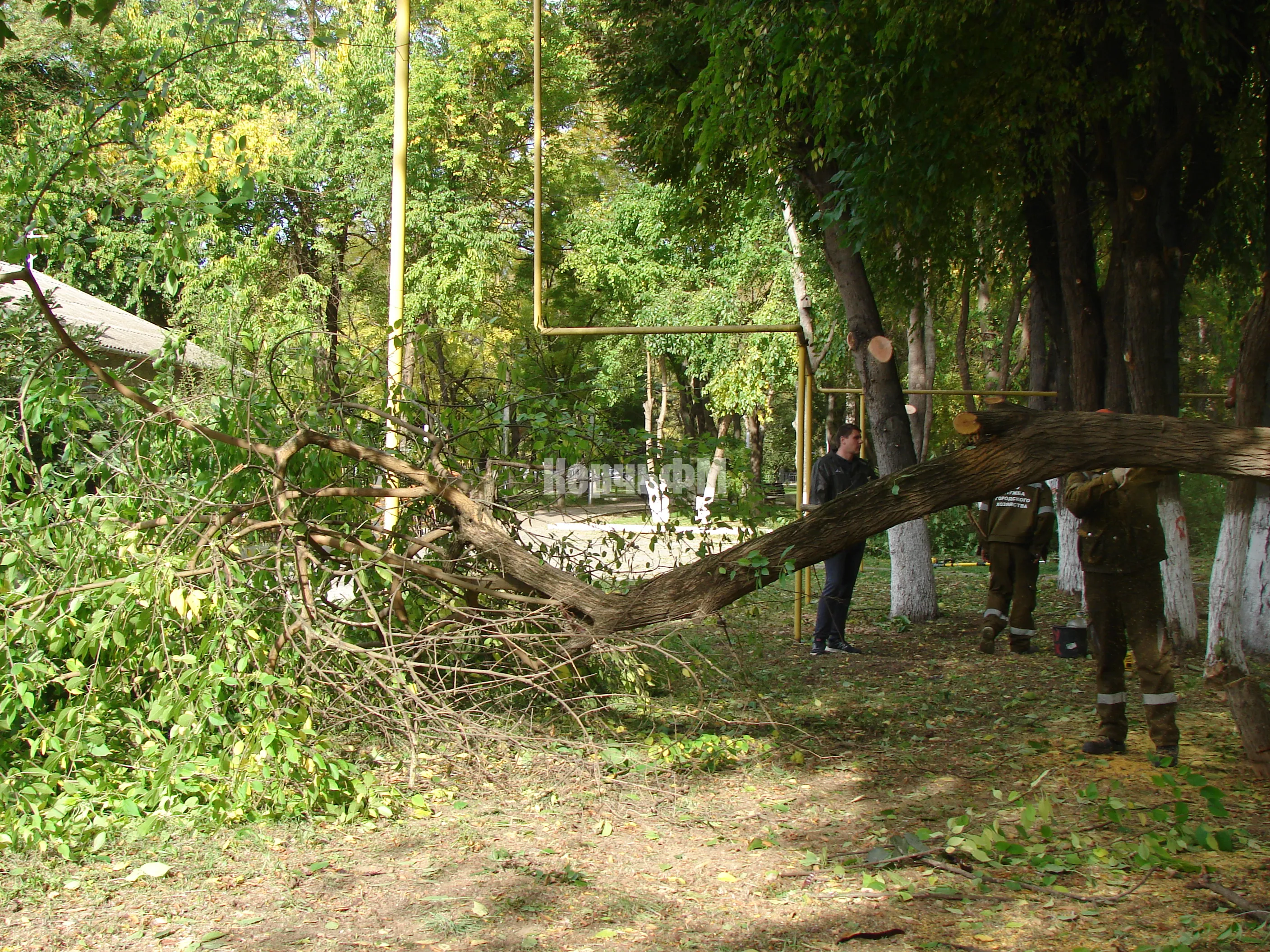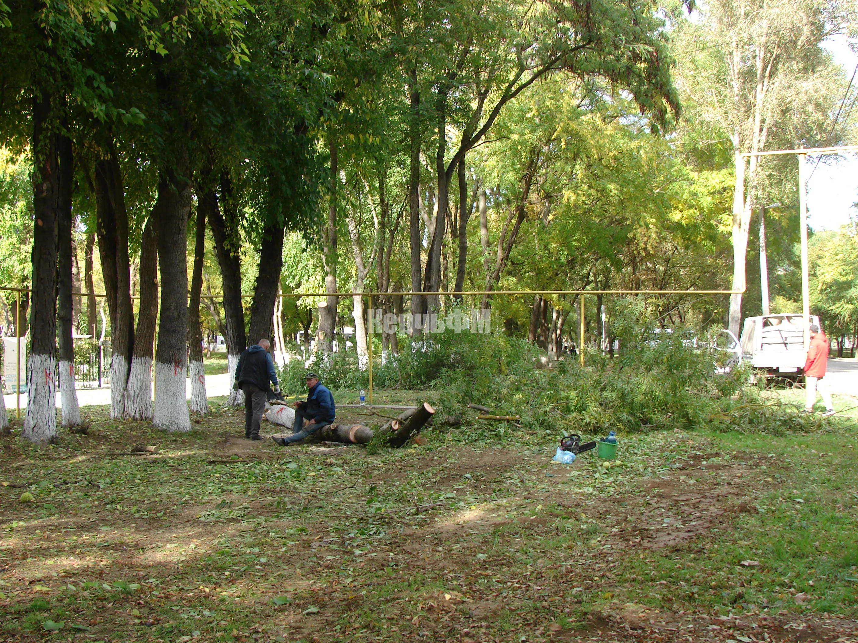 Специалисты Службы городского хозяйства Керчи ведут спил веток и стволов высоких деревьев в разных районах города.