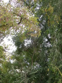 Если посмотреть вверх и приглядеться, то можно увидеть обломанные ветки, которые не упали на землю только потому, что застряли между зарослями.