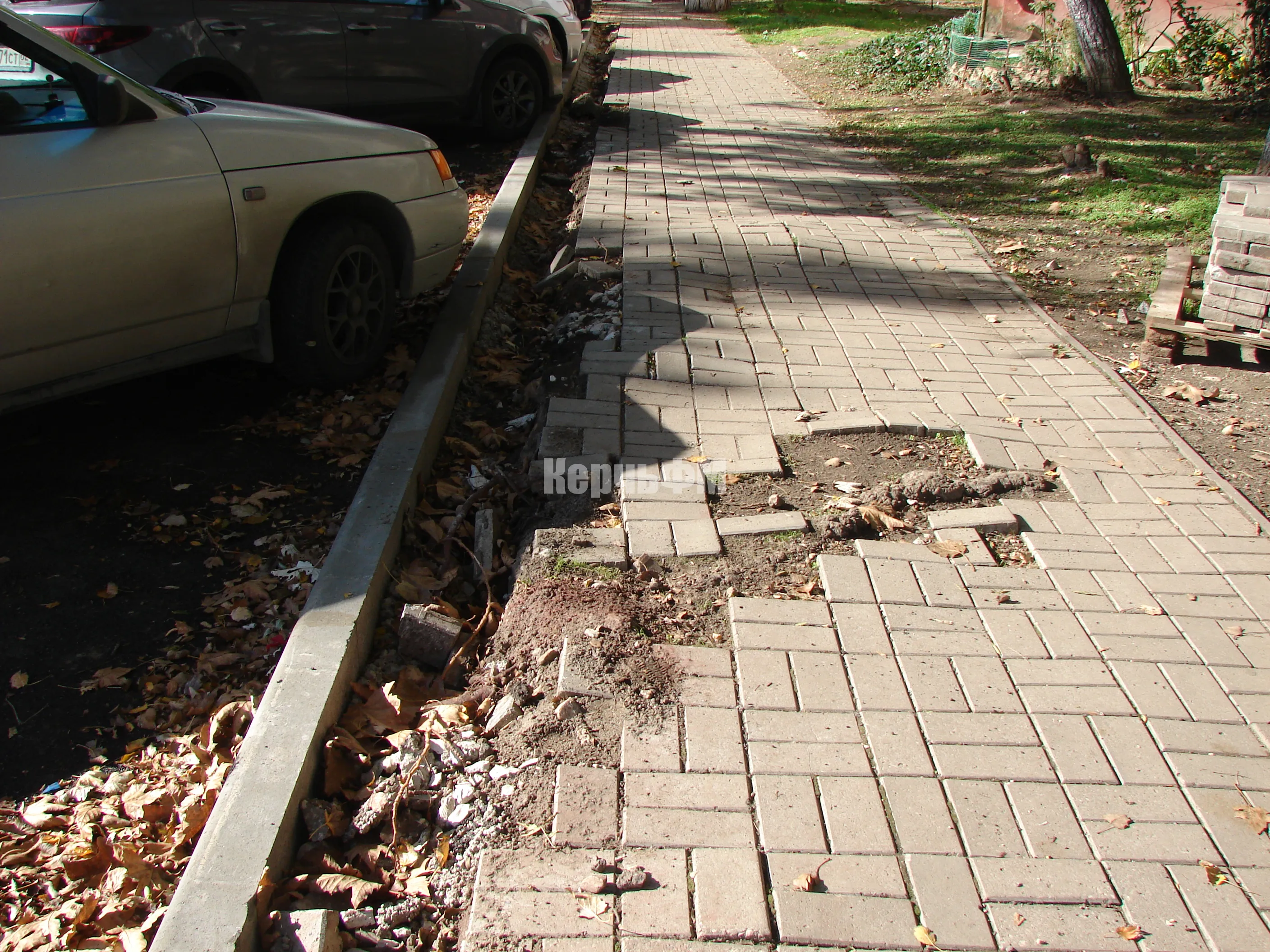 Своей очереди ожидает тротуарная плитка, снятая во время укладки бордюров вдоль пешеходной дорожки.