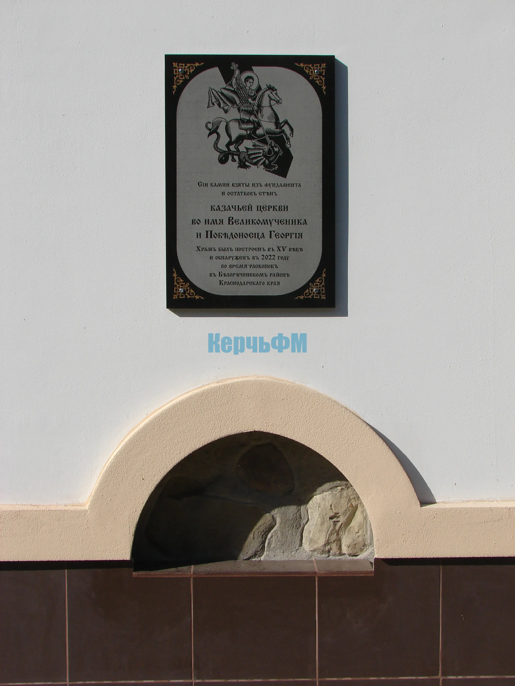 Табличка гласит: "Камни не простые. Они взяты из фундамента и стен казачьей церкви во имя Великомученика и Победоносца Георгия. Храм был построен в 15 веке и обнаружен при раскопках в 2022 году в Белореченском районе Краснодарского края."