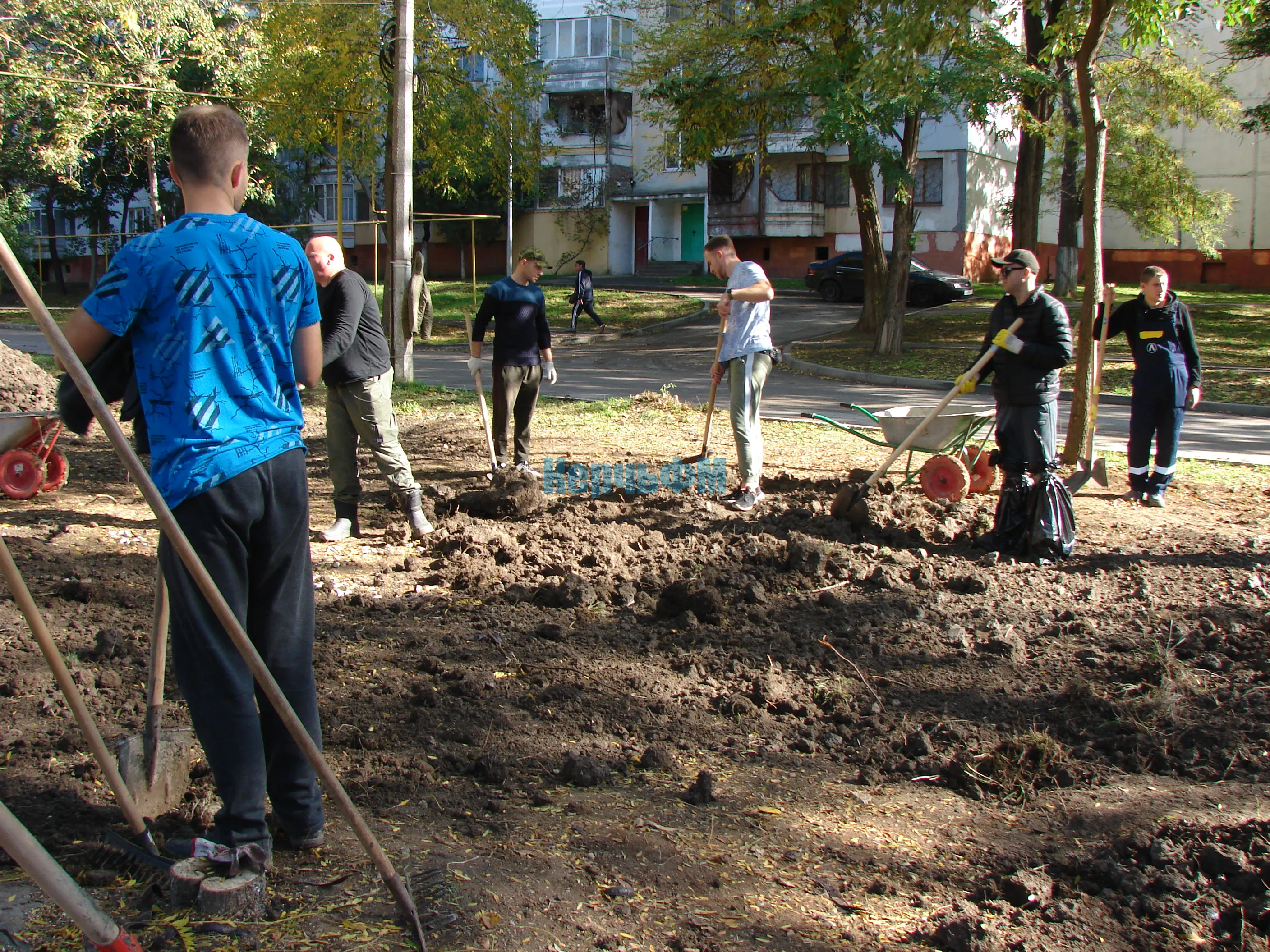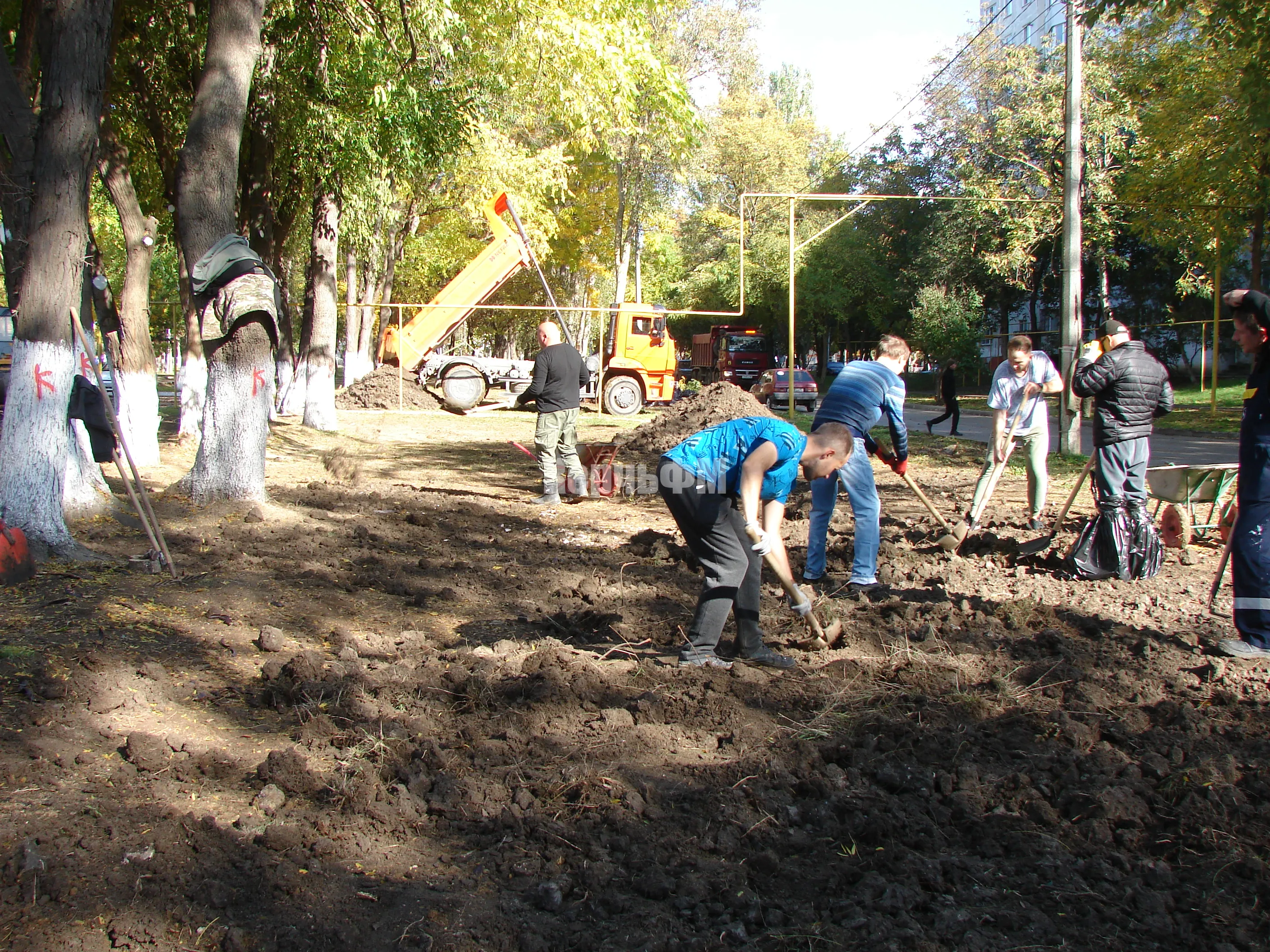 Теперь рабочие разравнивают землю на зеленой зоне.