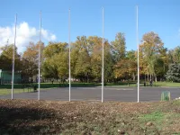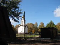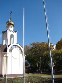 У часовни установлены флагштоки, а на одной из стен появилась табличка, под которой вмурованы камни.