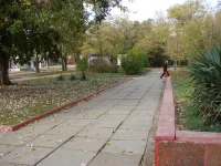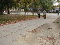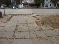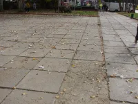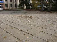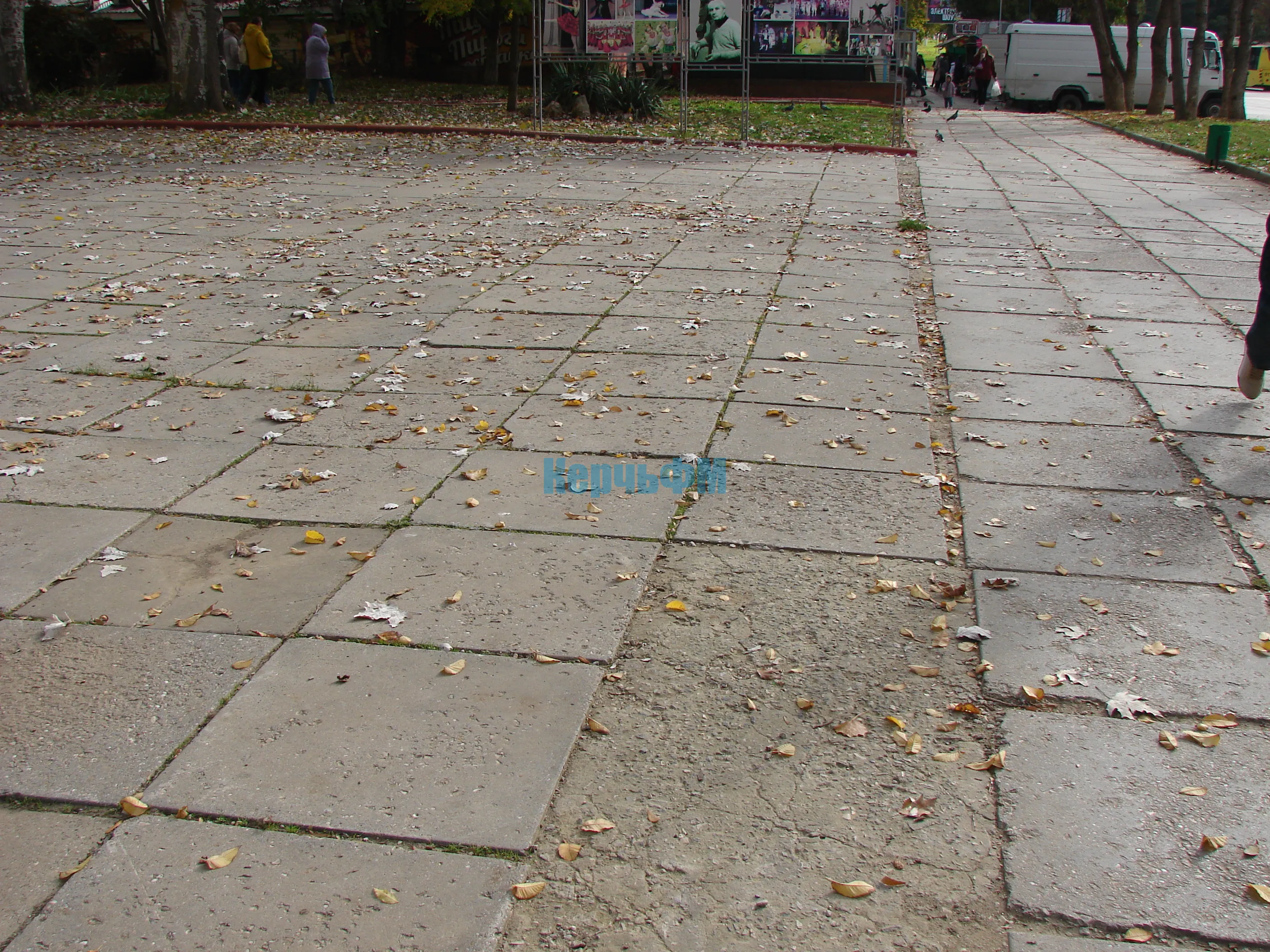 Между тротуарными плитами, которыми выложена площадь перед ней, и на боковых пешеходных дорожках образовались большие прогалы. Многие из плит продавлены.