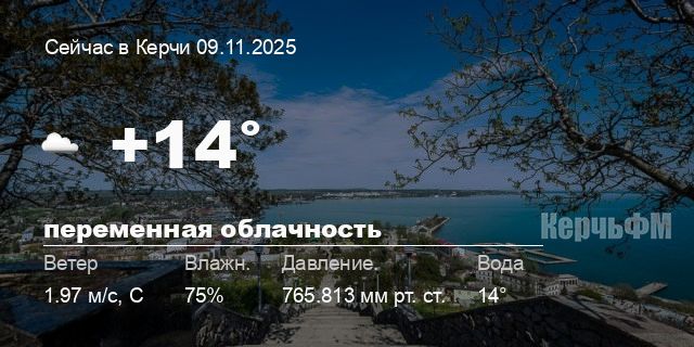 Сегодня днем в Керчи, 09 ноября, ожидается небольшая облачность, температура воздуха от +12.5° до +15.8°С, ветер северный 1.59 м/с, порывы до 2.14 м/с, давление 765.8 мм рт. ст., влажность 71%.