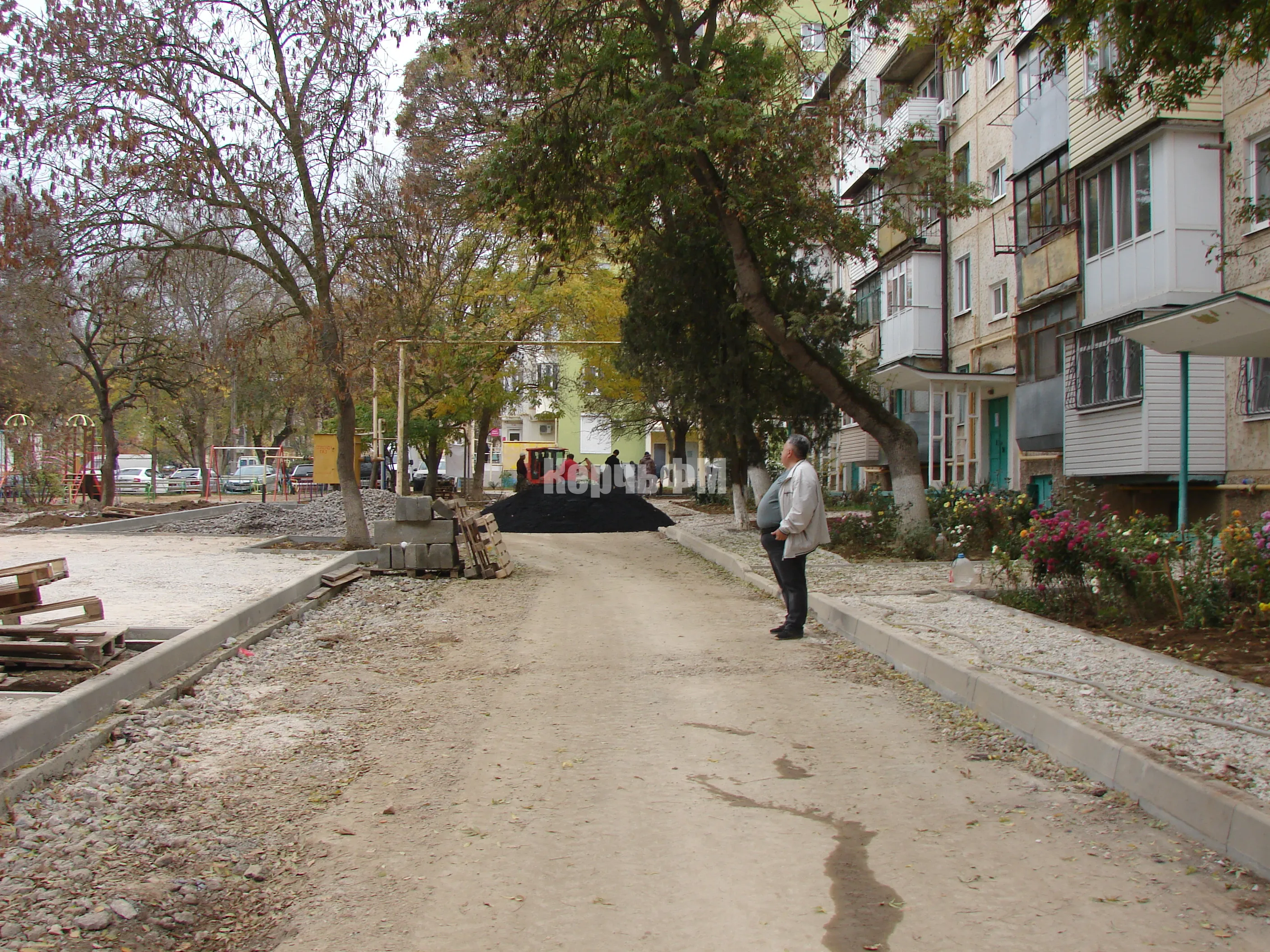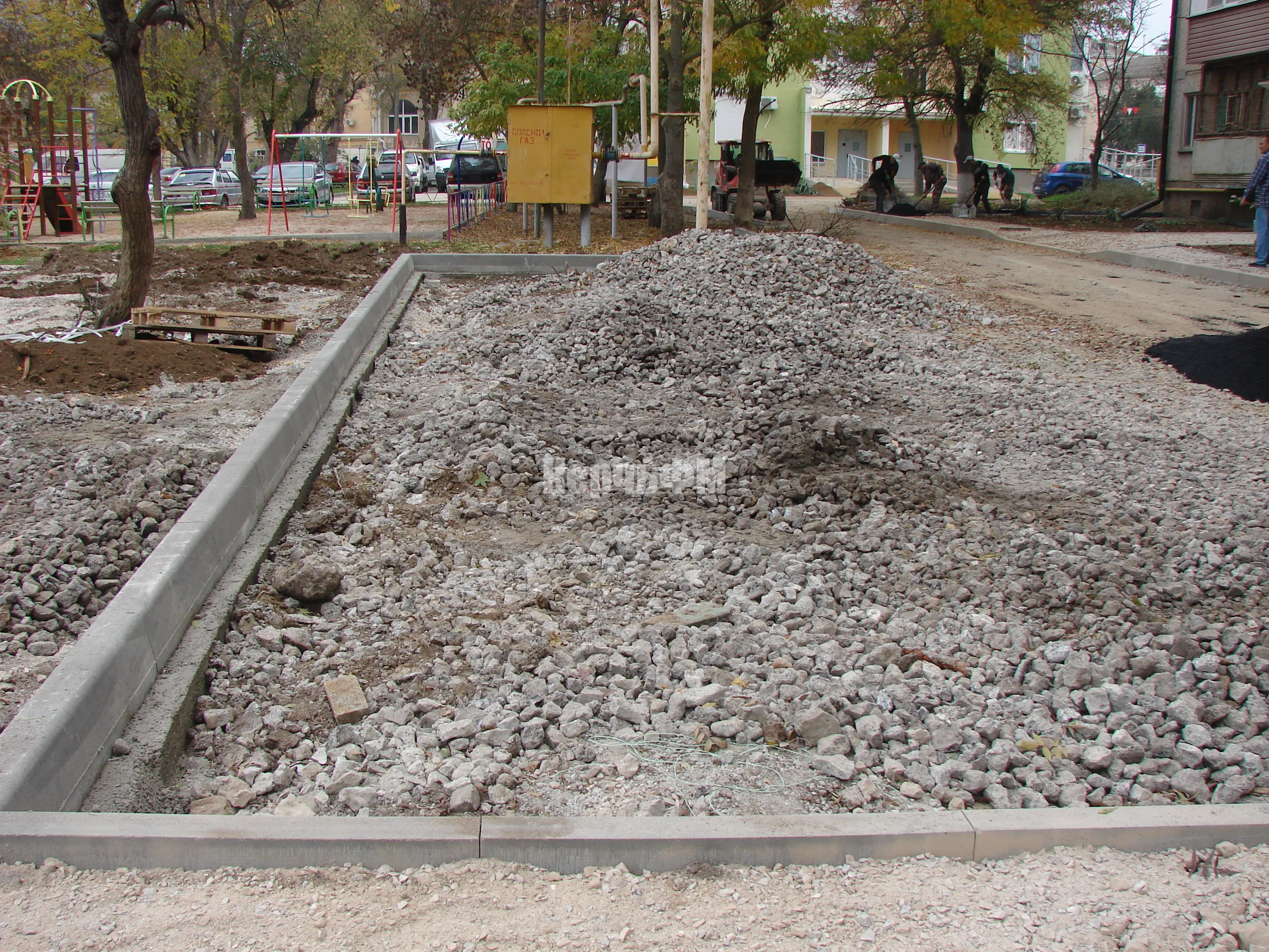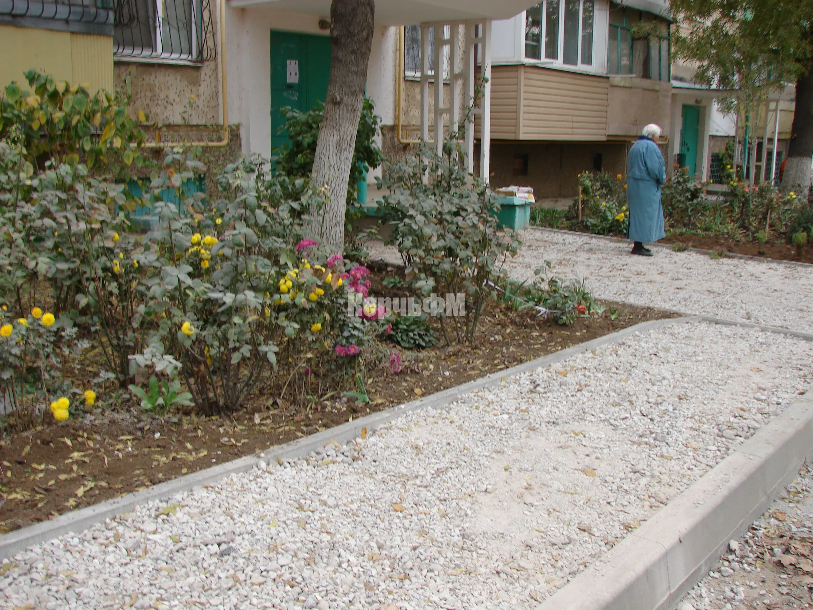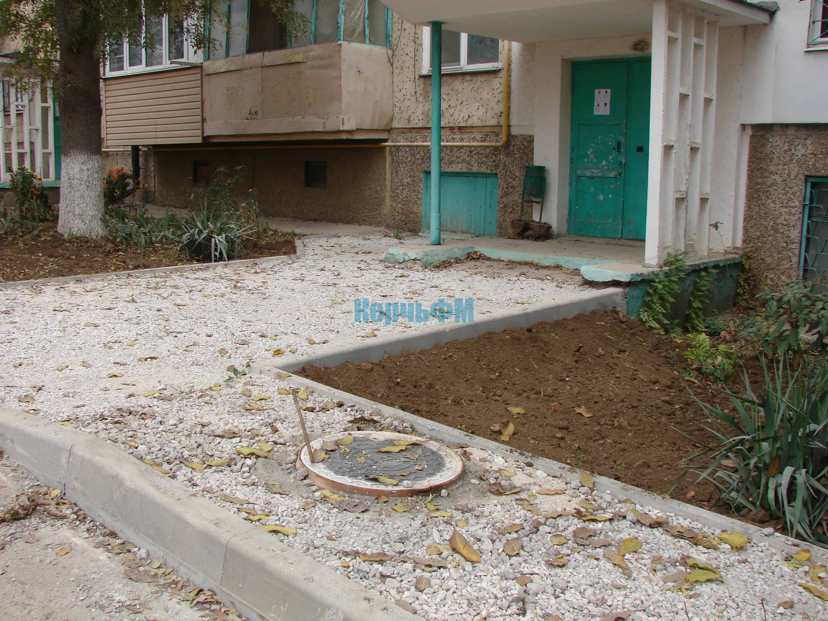 На этом объекте распланировали территорию под площадки, установили бордюры вдоль подъездных дорог и подходов к подъездам, а также вдоль новых пешеходных дорожек.