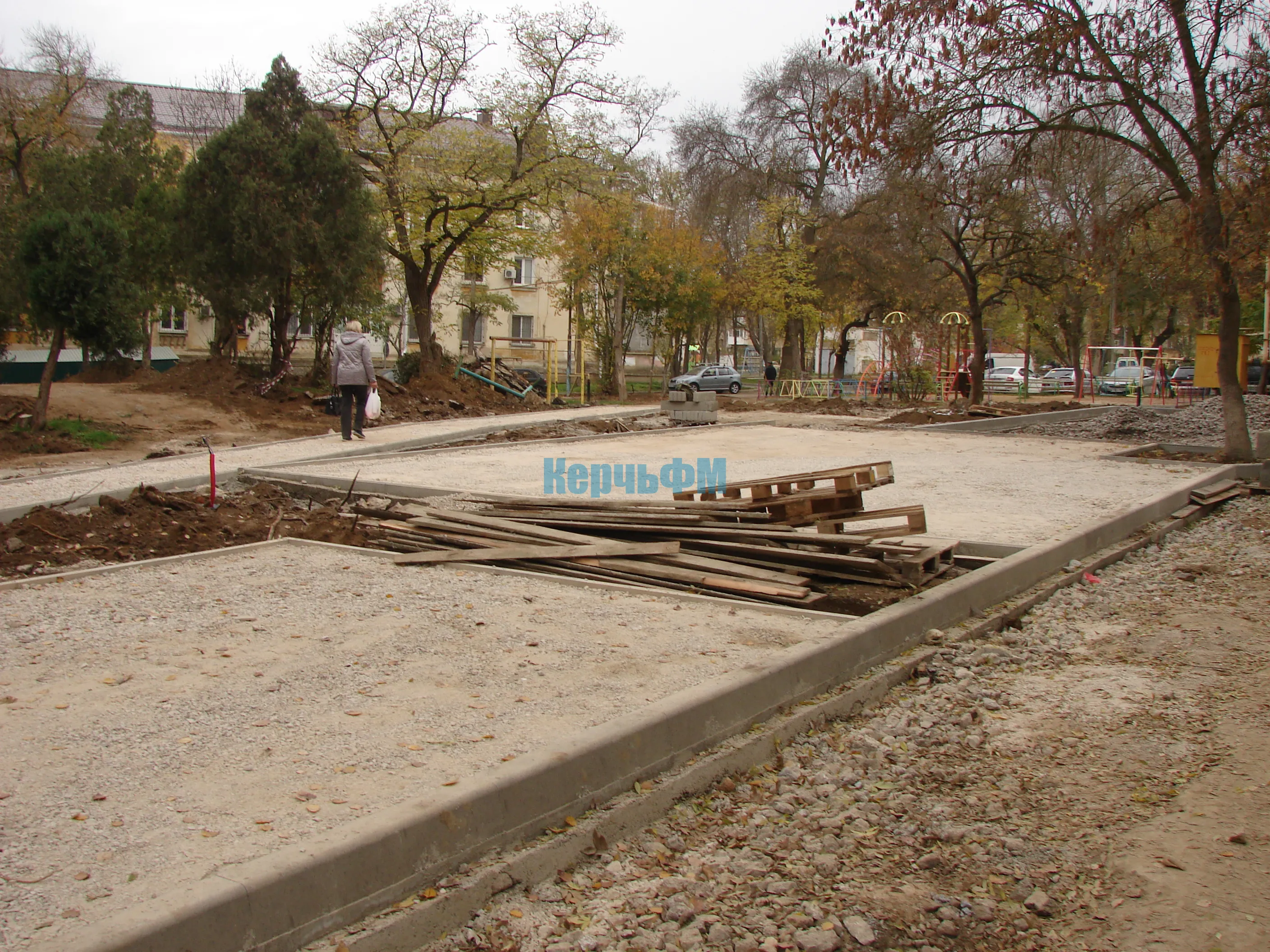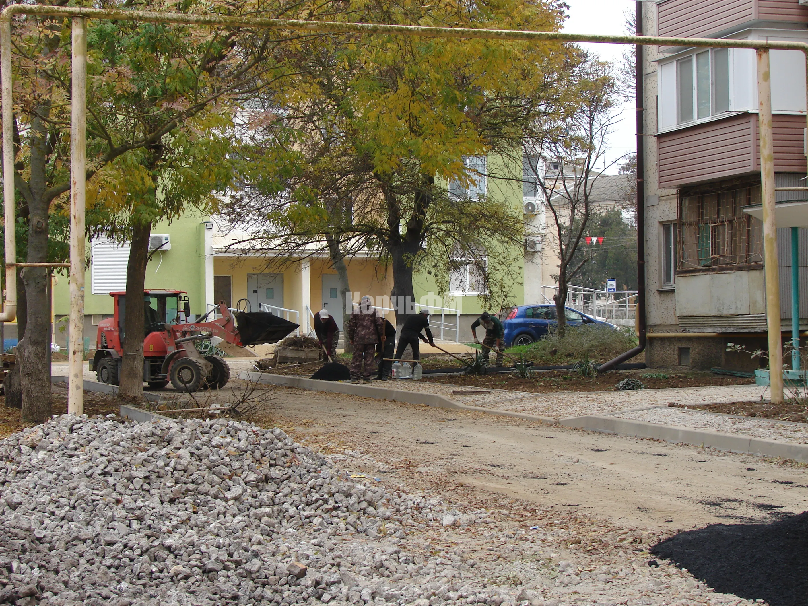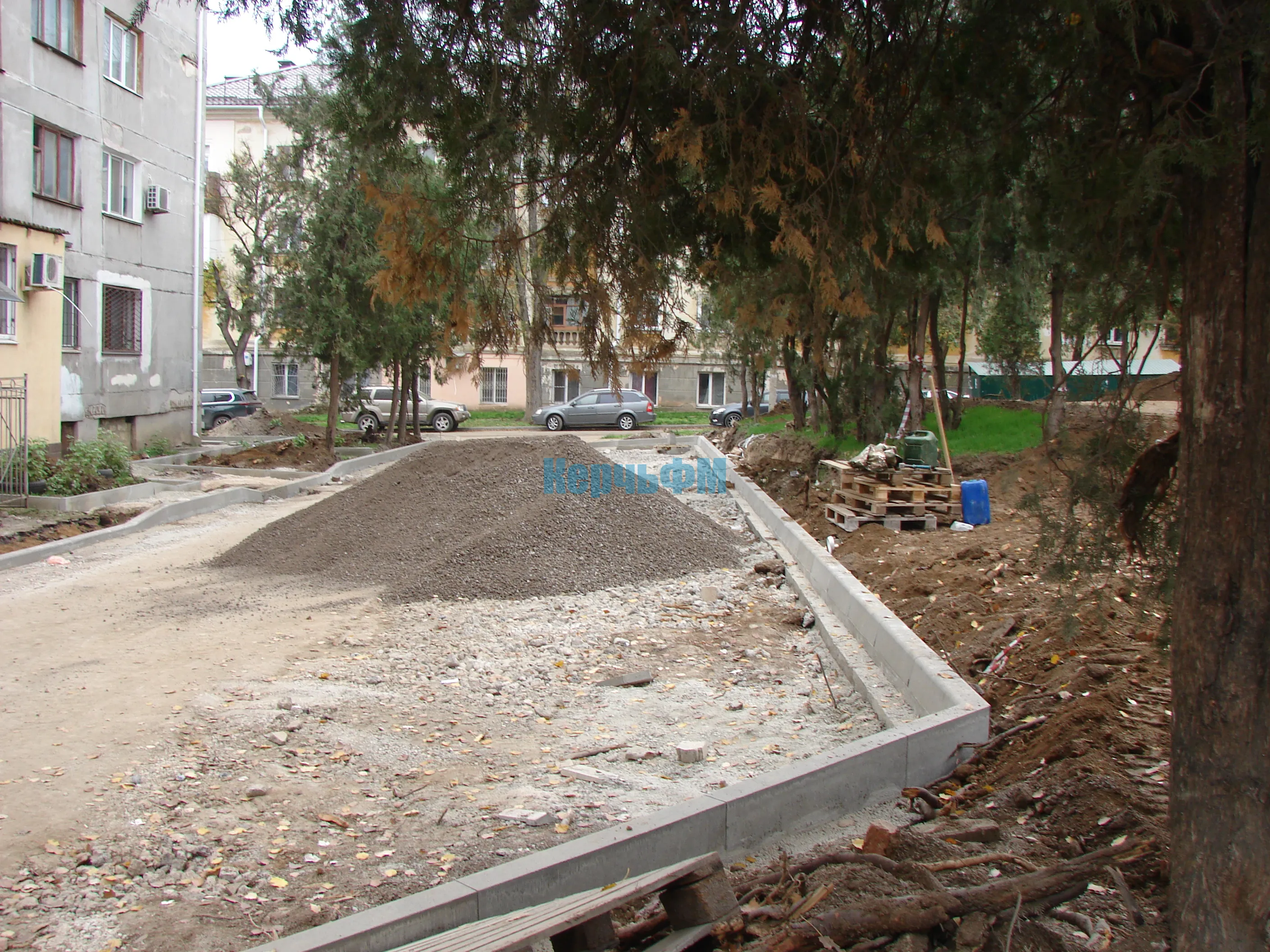 Рабочие подрядчика разравнивают землю на газонах и готовятся к укладке асфальта, передает КерчьФМ.