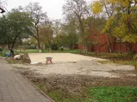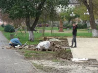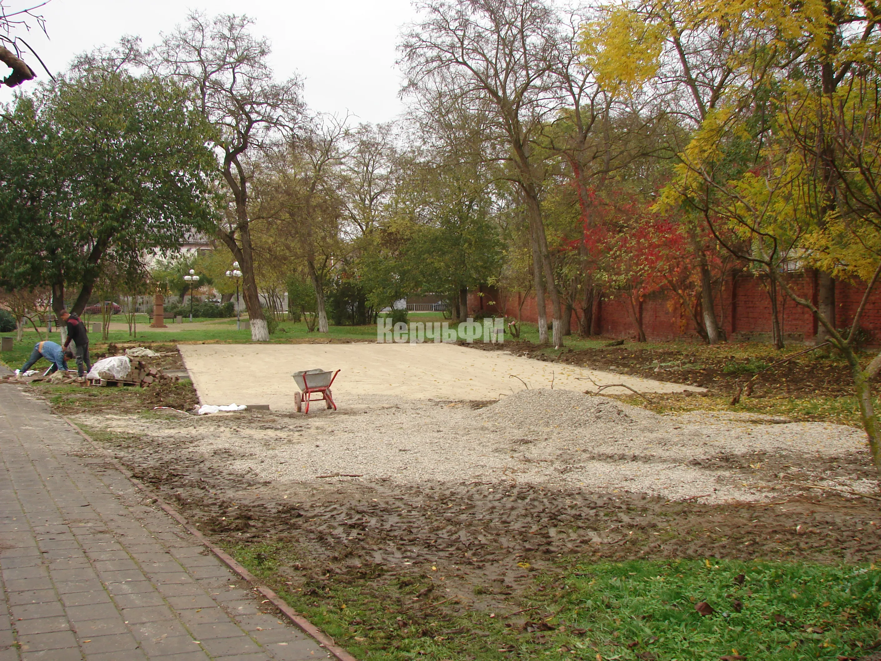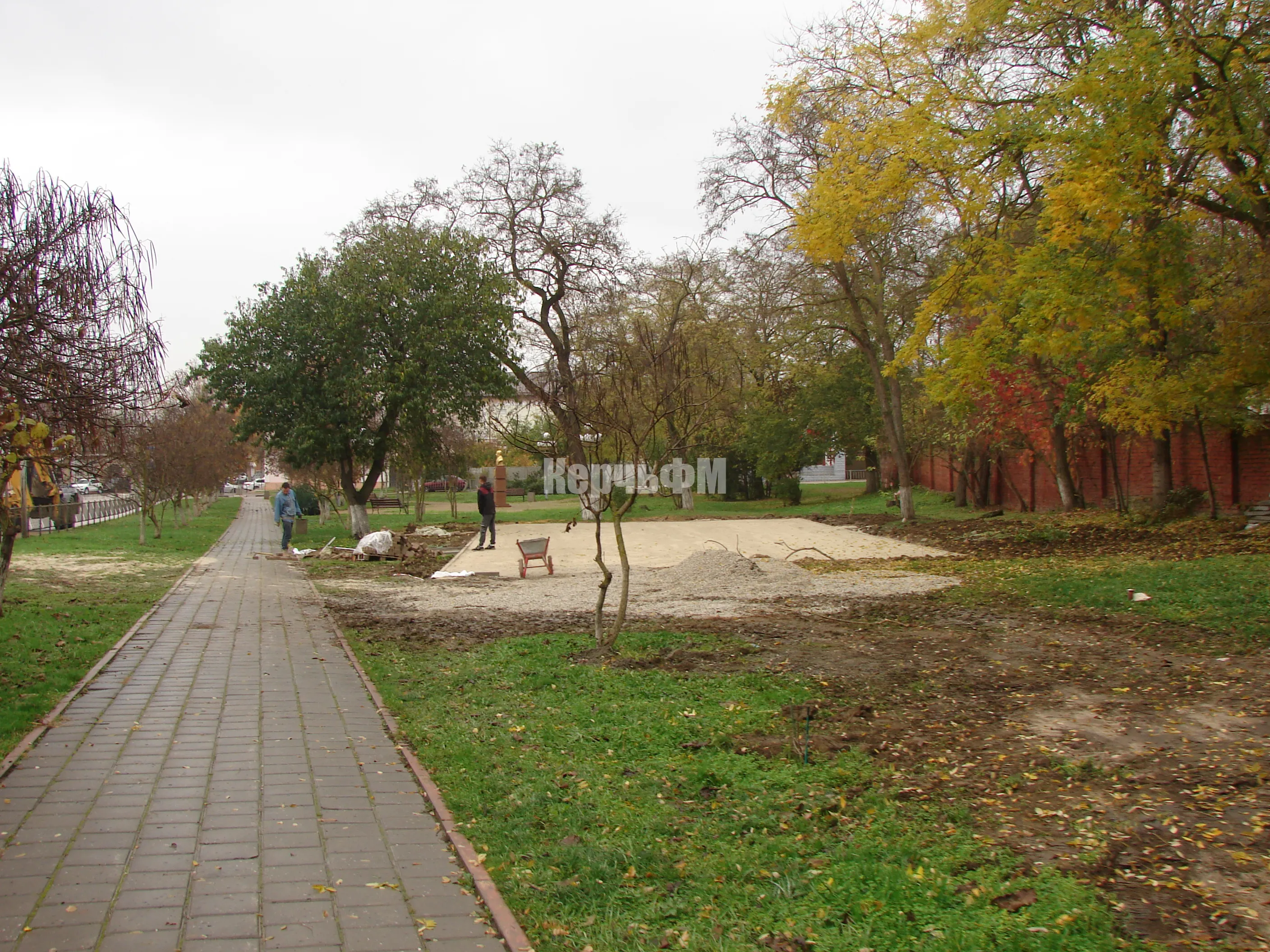 Основание под установку детской площадки строители обустраивают в сквере Н.И. Пирогова, недалеко от памятника выдающемуся врачу-хирургу.