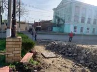 Работы по демонтажу старой тротуарной плитки на улице Пролетарской были начаты от улицы Козлова и дошли до улицы Кирова.