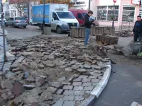 Выезд с Дубинина преграждает складированная тротуарная плитка. Продолжаются работы по обновлению тротуара.