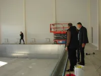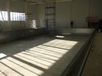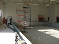 Отставаний от графика нет и к апрелю будущего года бассейн на 6 плавательных дорожек длиной 25 метров будет готов к эксплуатации.