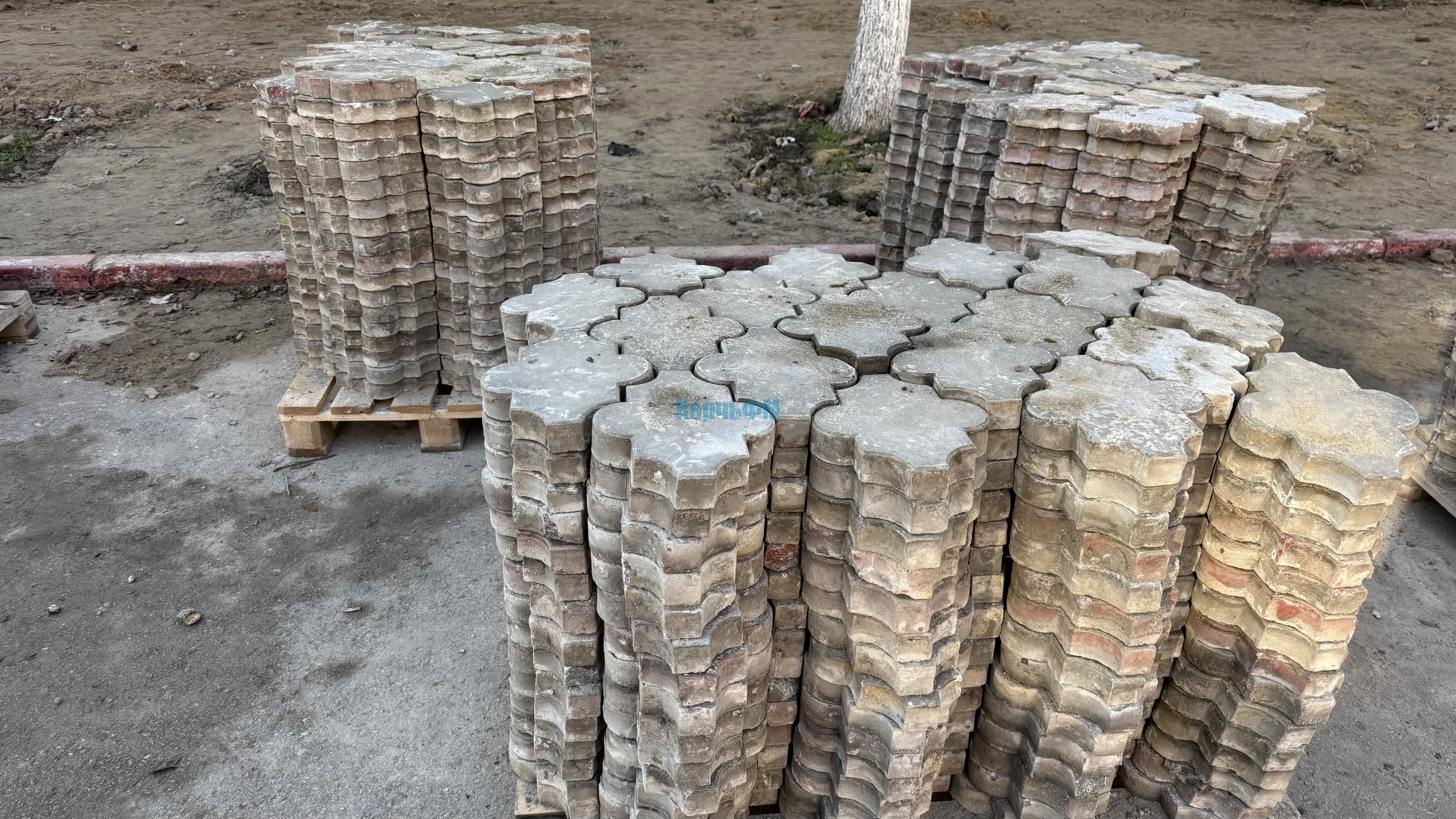 Специалисты заняты демонтажем старой плитки. Её аккуратно собирают на паллеты, чтобы вывезти. Работы идут активно.