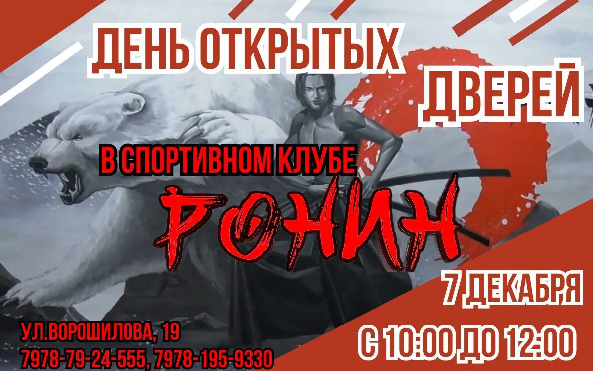 7 декабря с 10:00 до 12:00 спортивный клуб «Ронин» приглашает Вас на День открытых дверей. Это отличная возможность познакомиться с тренерами, попробовать занятия и почувствовать атмосферу, в которой у нас тренируются целыми семьями.