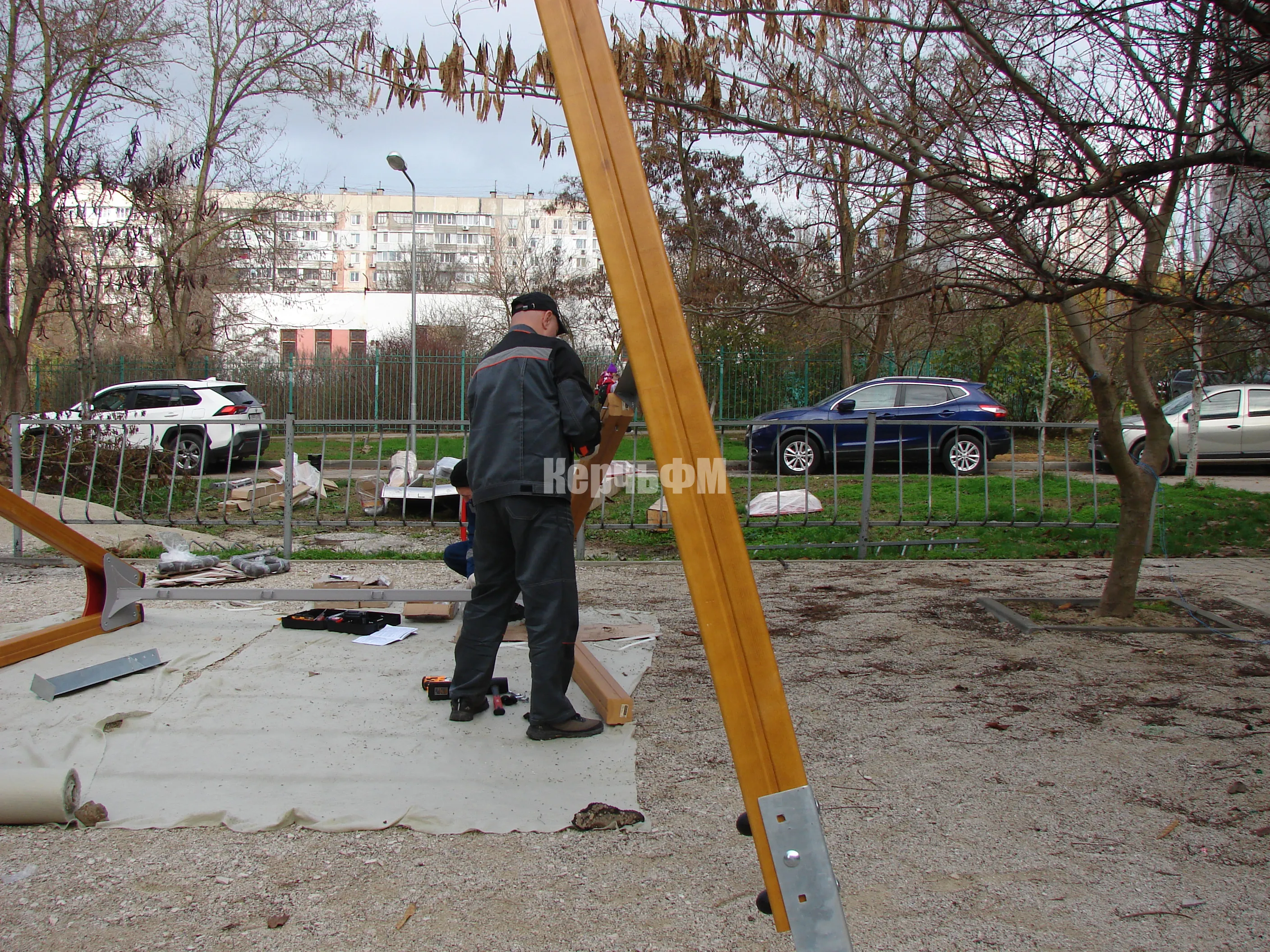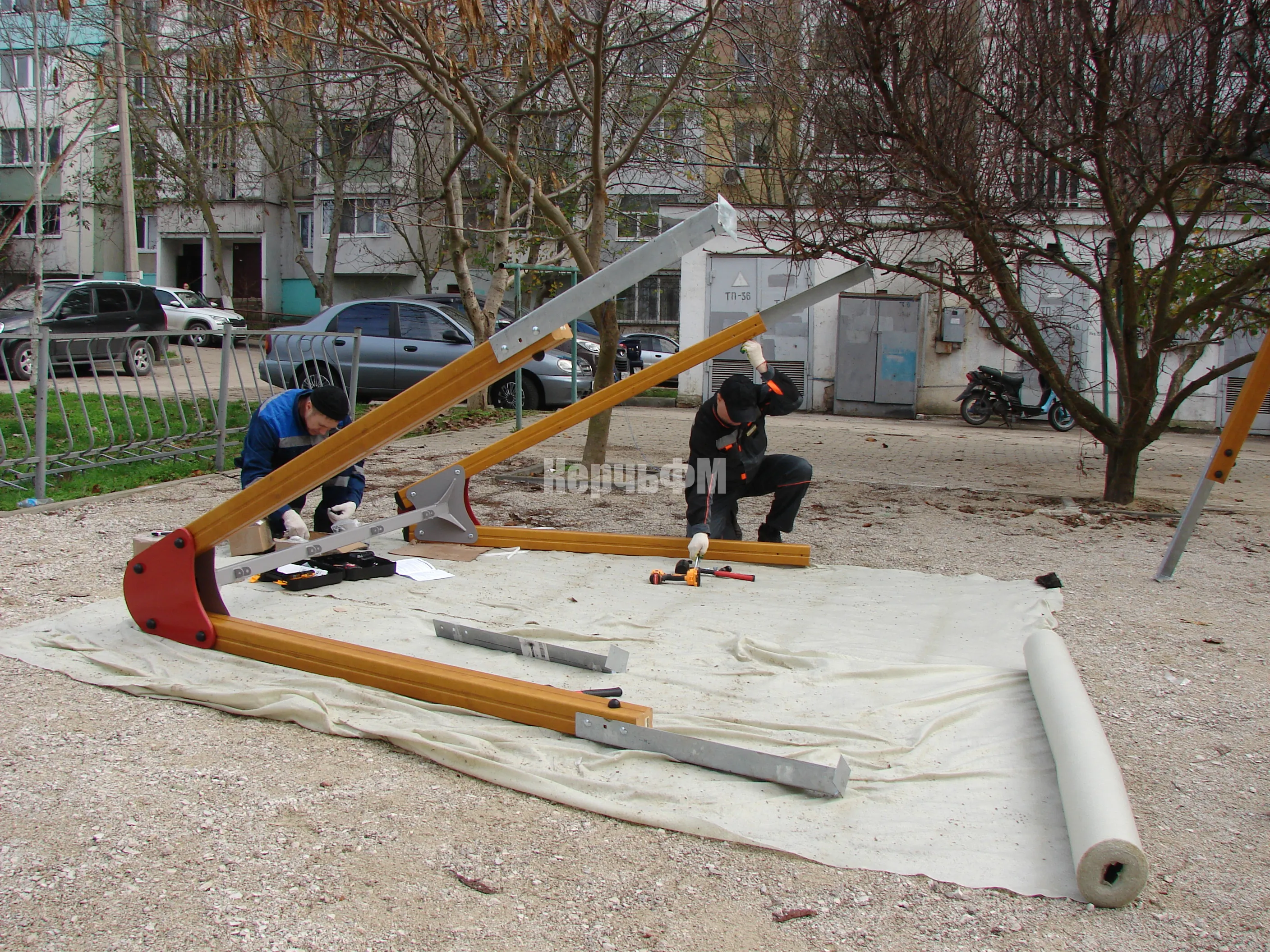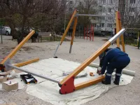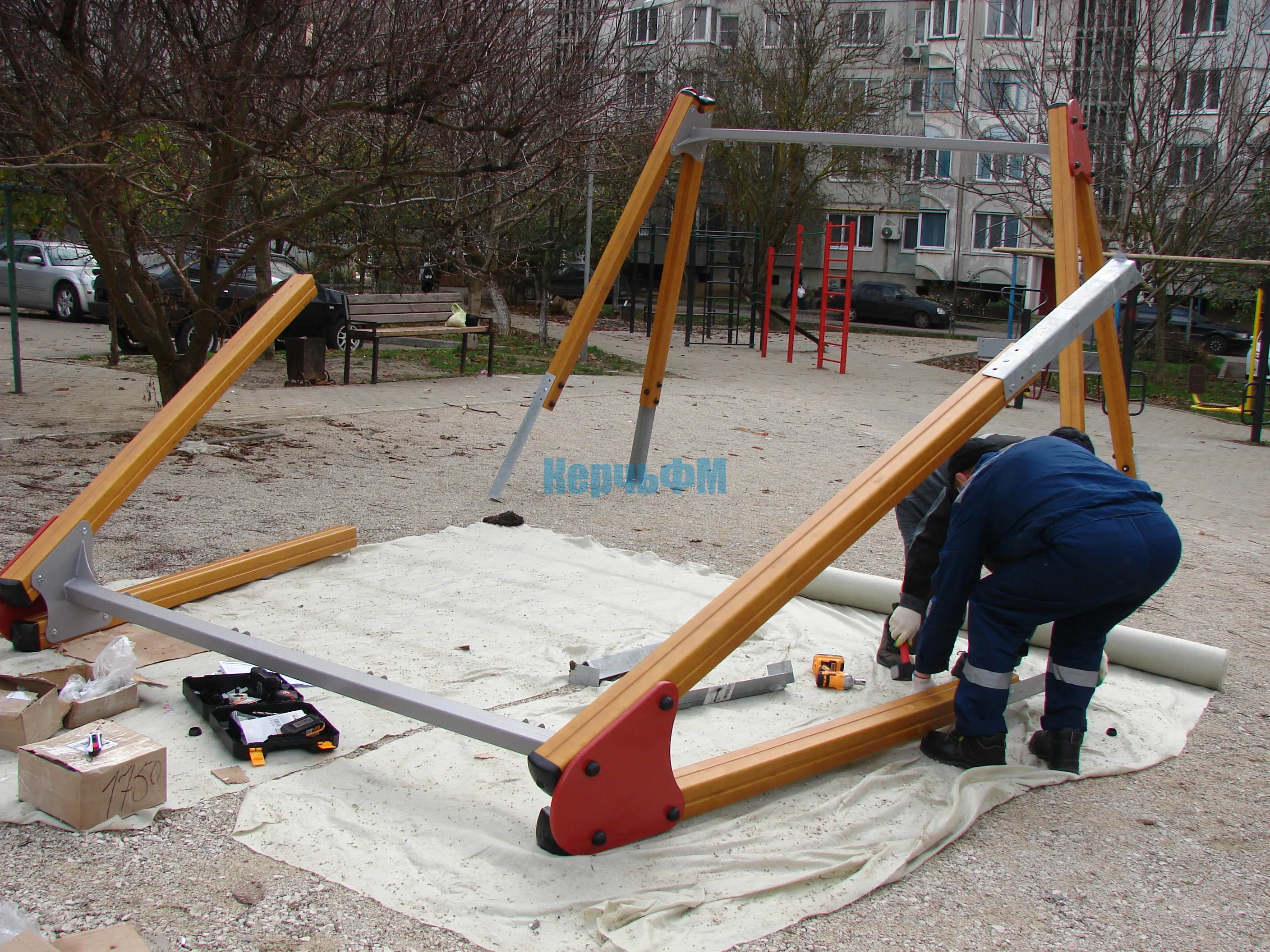 Работа стартовала с монтажа опор для качелей. Далее на очереди будет горка.