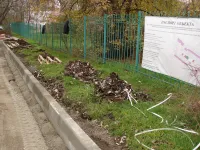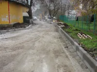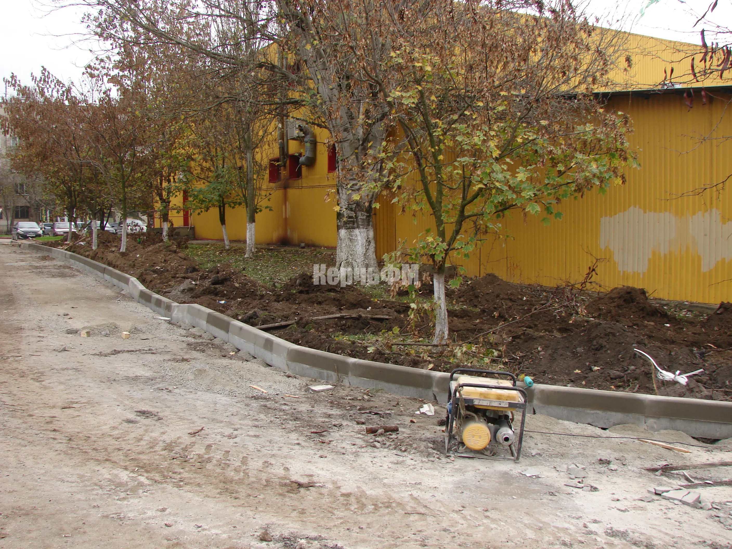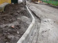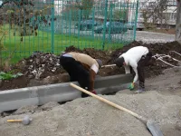 Со стороны домов по Генерала Петрова, 16 и Сморжевского, 3 устанавливают новые бордюры на примыкающей территории.