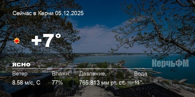 Сегодня днем в Керчи, 05 декабря, ожидается ясная погода, температура воздуха от +7° до +8.3°С, ветер северный 8.83 м/с, порывы до 9.22 м/с, давление 765.1 мм рт. ст., влажность 71%.