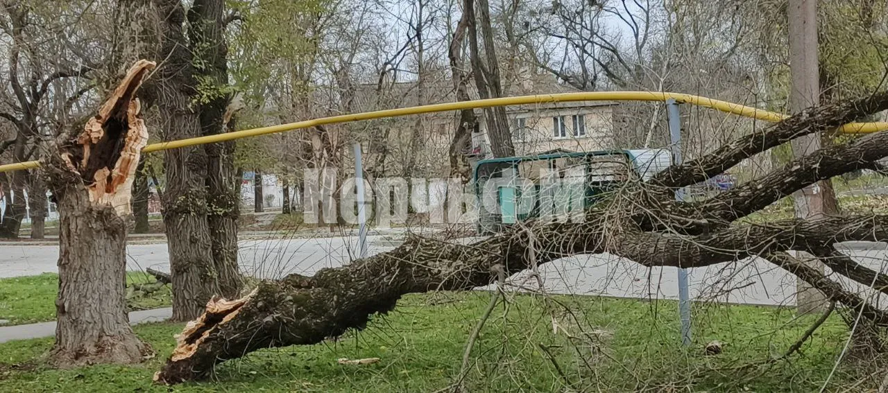 Сегодня, около 14 часов, во время сильного ветра дерево упало и погнуло газовую трубу.