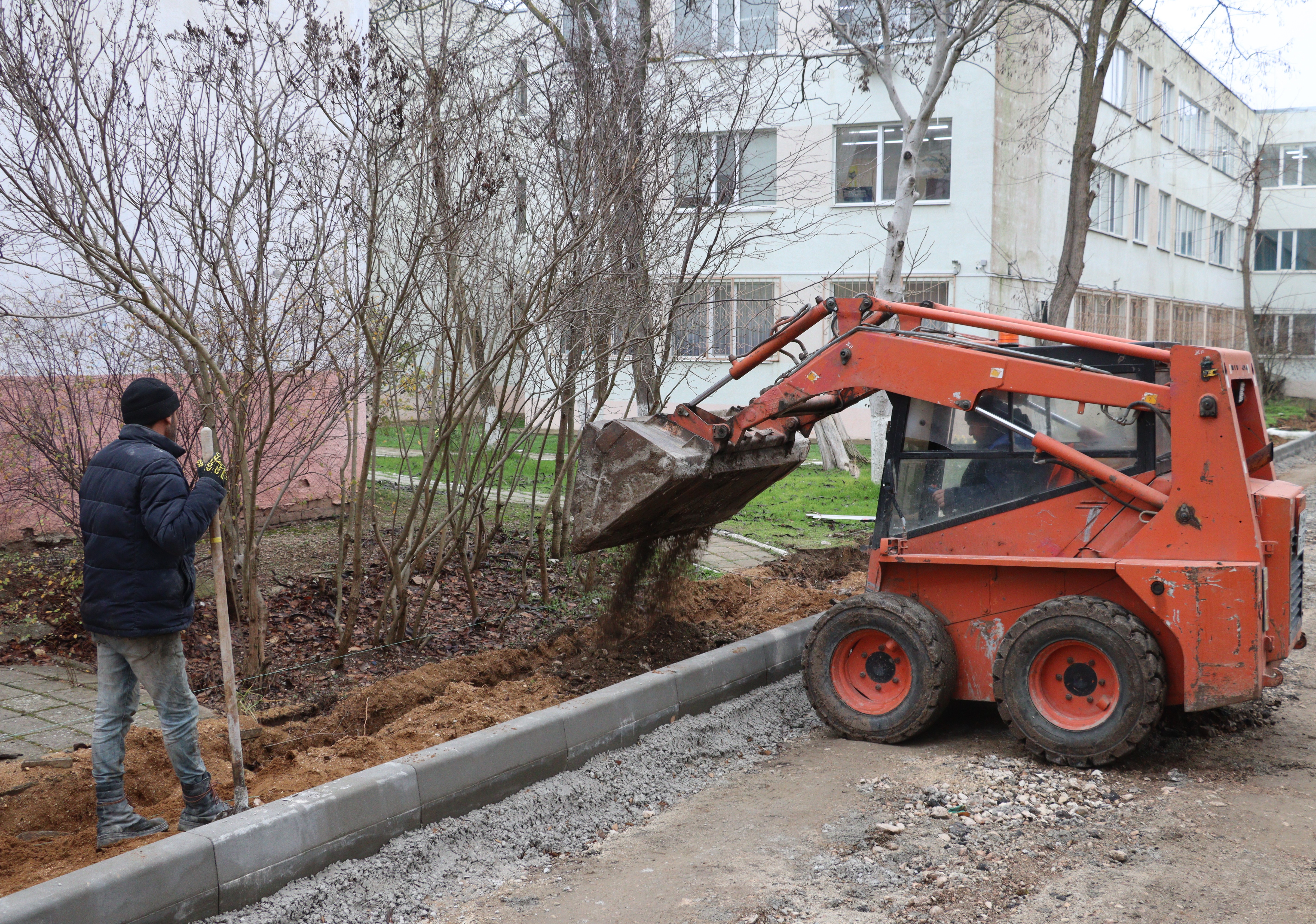 Ведутся работы и на территории школы №26 им. Героя Советского Союза Д.Т. Доева. Строители устанавливают бордюры вдоль тротуаров на заднем дворе учреждения, готовятся к асфальтированию проездов. Данная мера позволит отвести воду от здания и предотвратить подтопление фундамента. Всего планируют уложить около 1000 кв. м асфальтобетона.