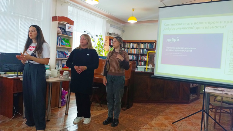 В начале встречи гостям рассказали о волонтерском движении. Ребята узнали, кто такие волонтеры, чем они занимаются и с какого возраста можно присоединиться к их рядам. Особое внимание уделили платформе «ДОБРО.РФ» - масштабному ресурсу, объединяющему тысячи волонтерских проектов и возможностей по всей стране. Школьники узнали о преимуществах электронной книжки волонтера, которая позволяет фиксировать свой вклад в общественно полезную деятельность. Важно отметить, что данные из такой книжки могут быть интегрированы с другими государственными информационными системами, такими как «Госуслуги», суперсервис «Поступление в вуз онлайн» и «Работа в России». Это означает, что активная волонтерская деятельность может стать весомым преимуществом при поступлении в высшие учебные заведения.