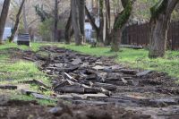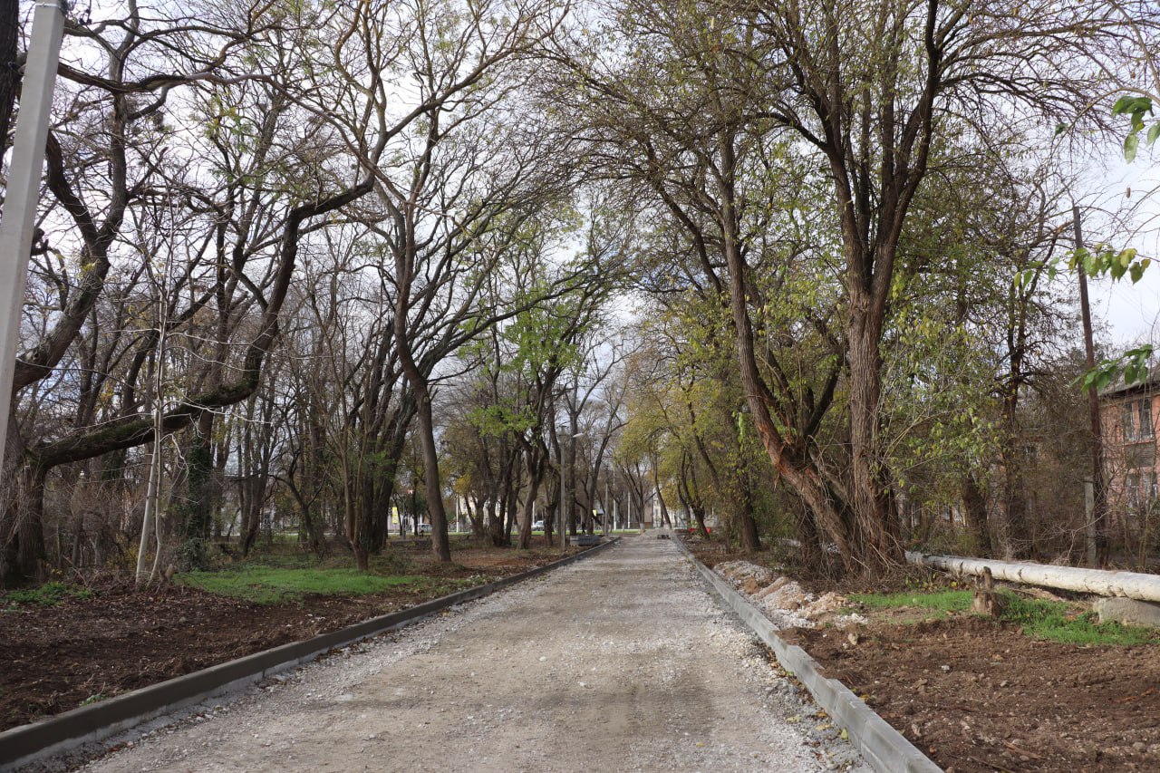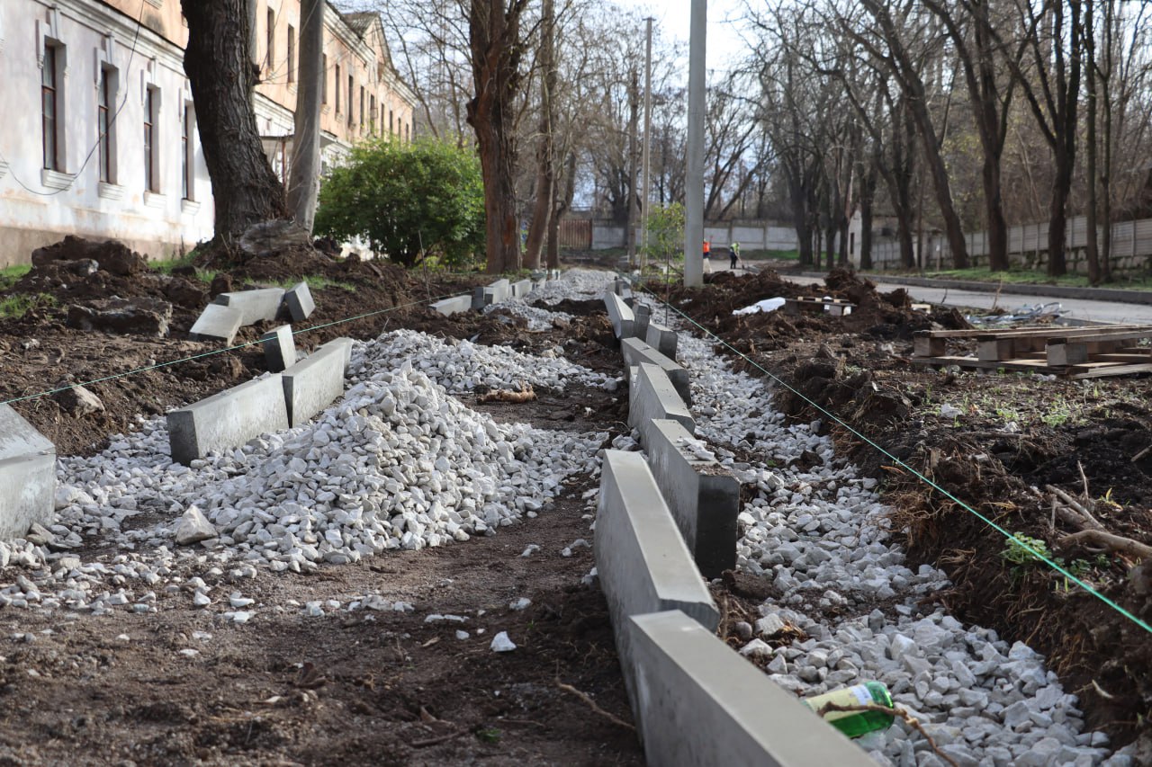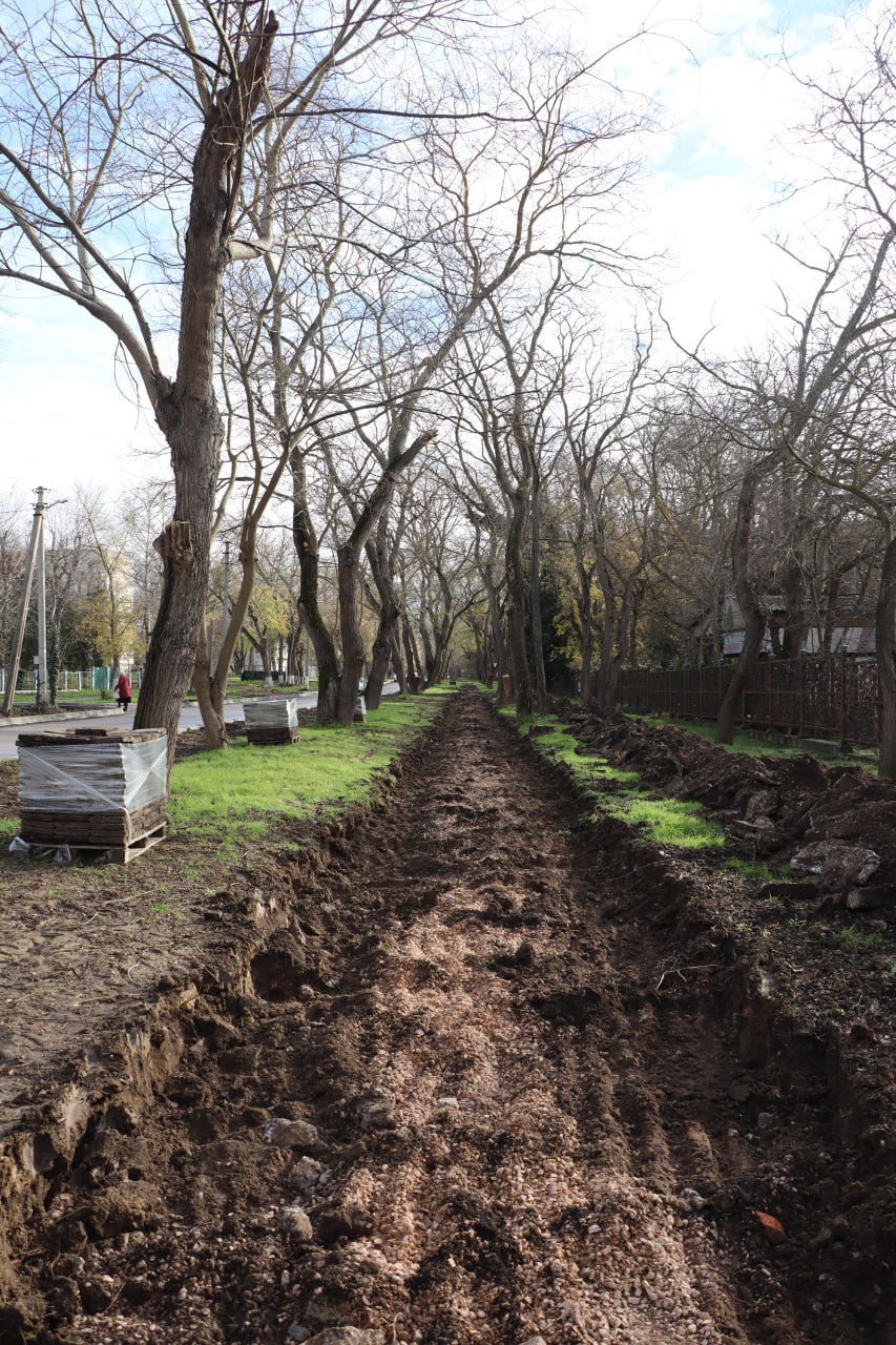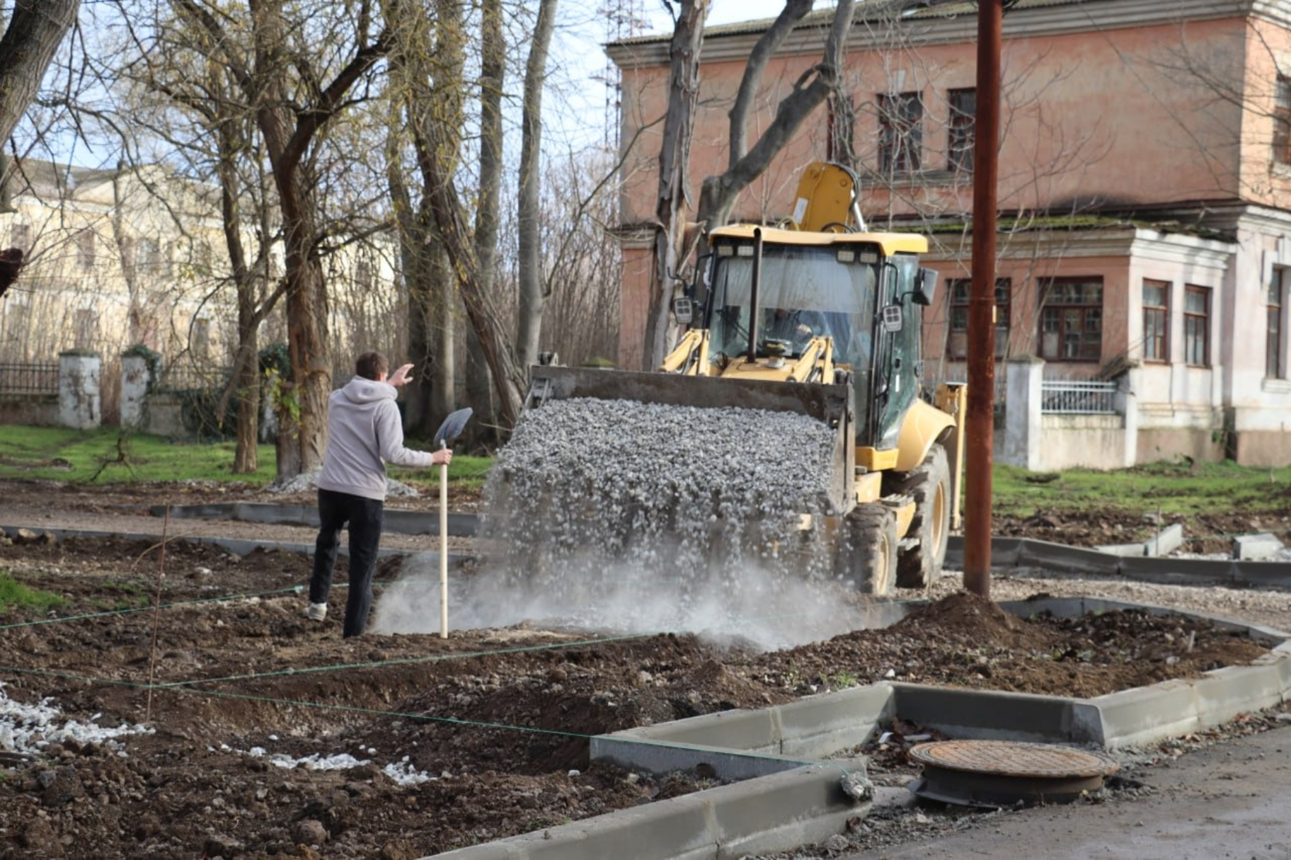 Работы идут одновременно на нескольких участках: в районе Гагаринского парка строители демонтируют старую плитку, а в начале улицы уже готовятся к установке бордюров. Работает тяжелая техника: отсыпает щебнем основание будущих аллей.