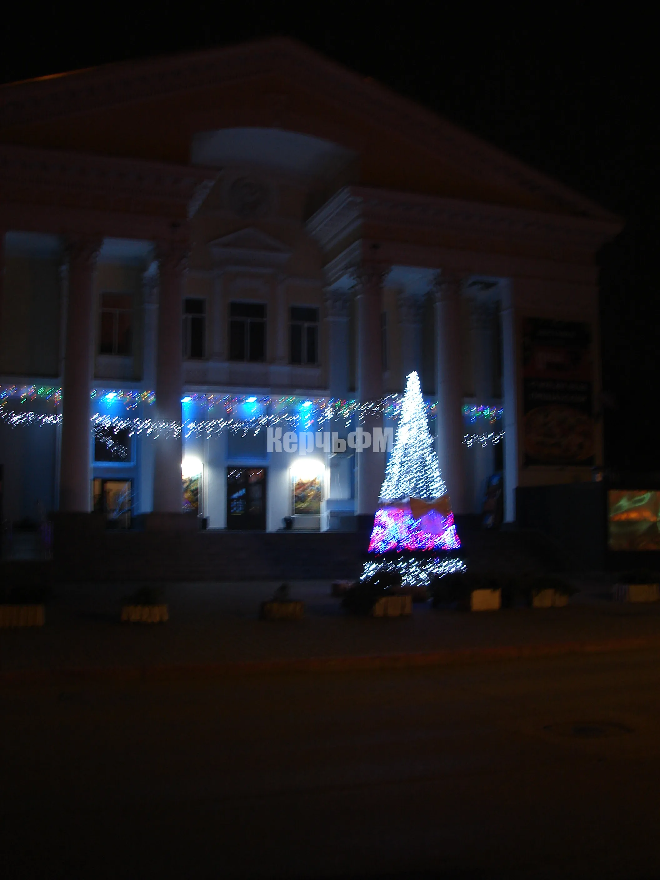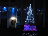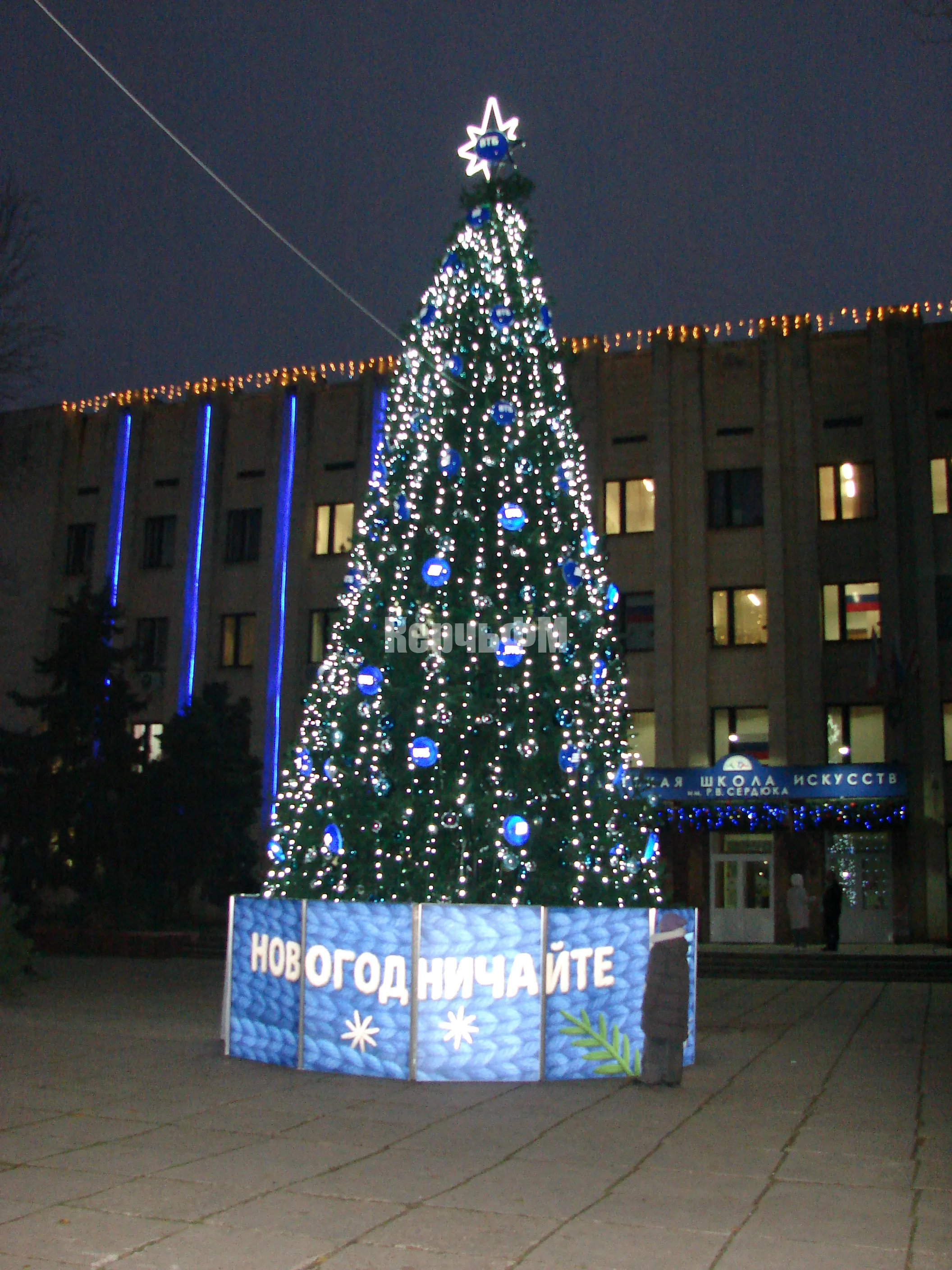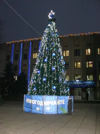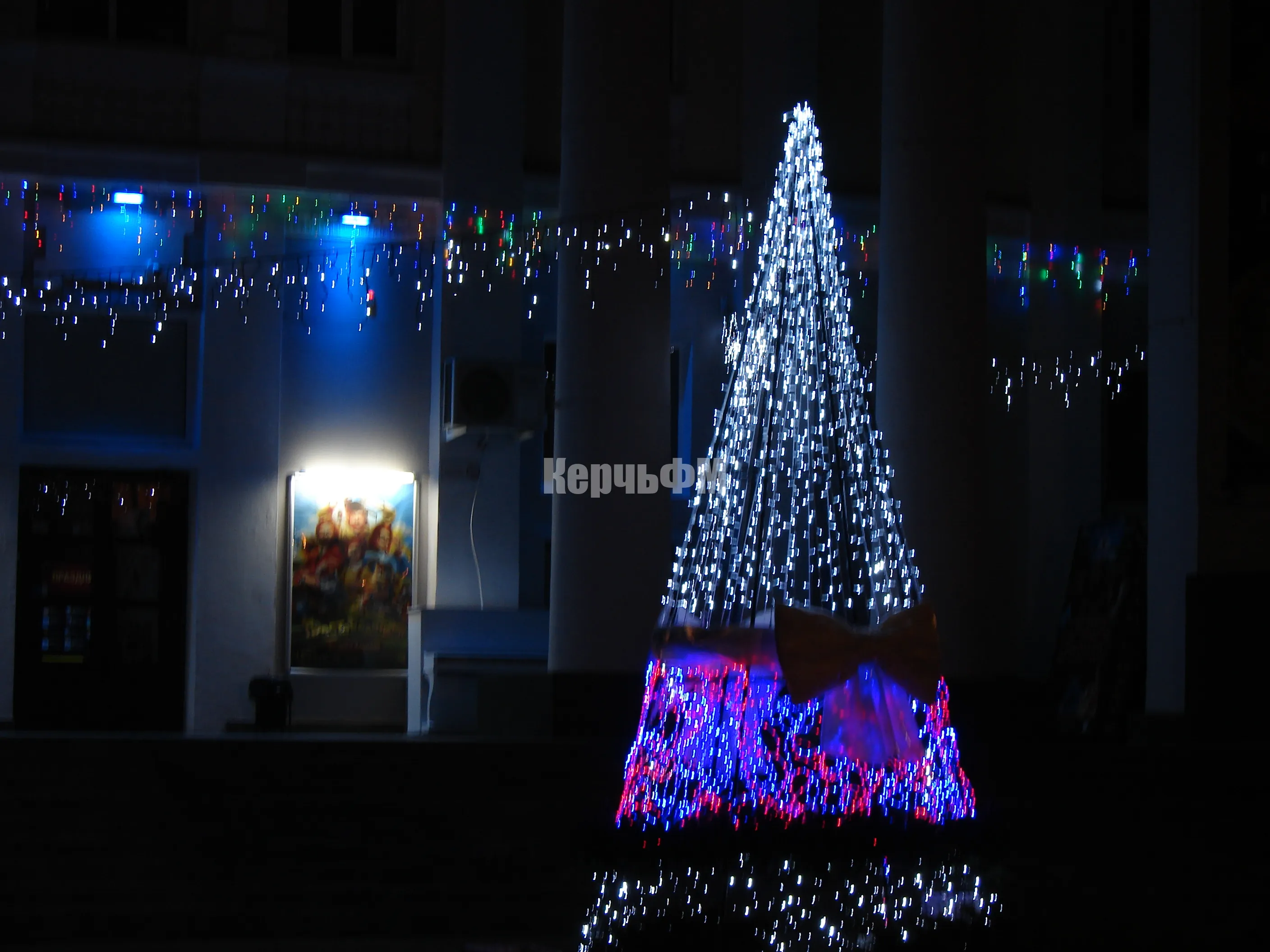 В этом году елочку чуть поменьше предыдущей зажгли и перед зданием кинотеатра "Украина".