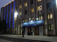 Горят синие гирлянды не только на фасаде здания, но и на 10-метровой елке, установленной перед ним.