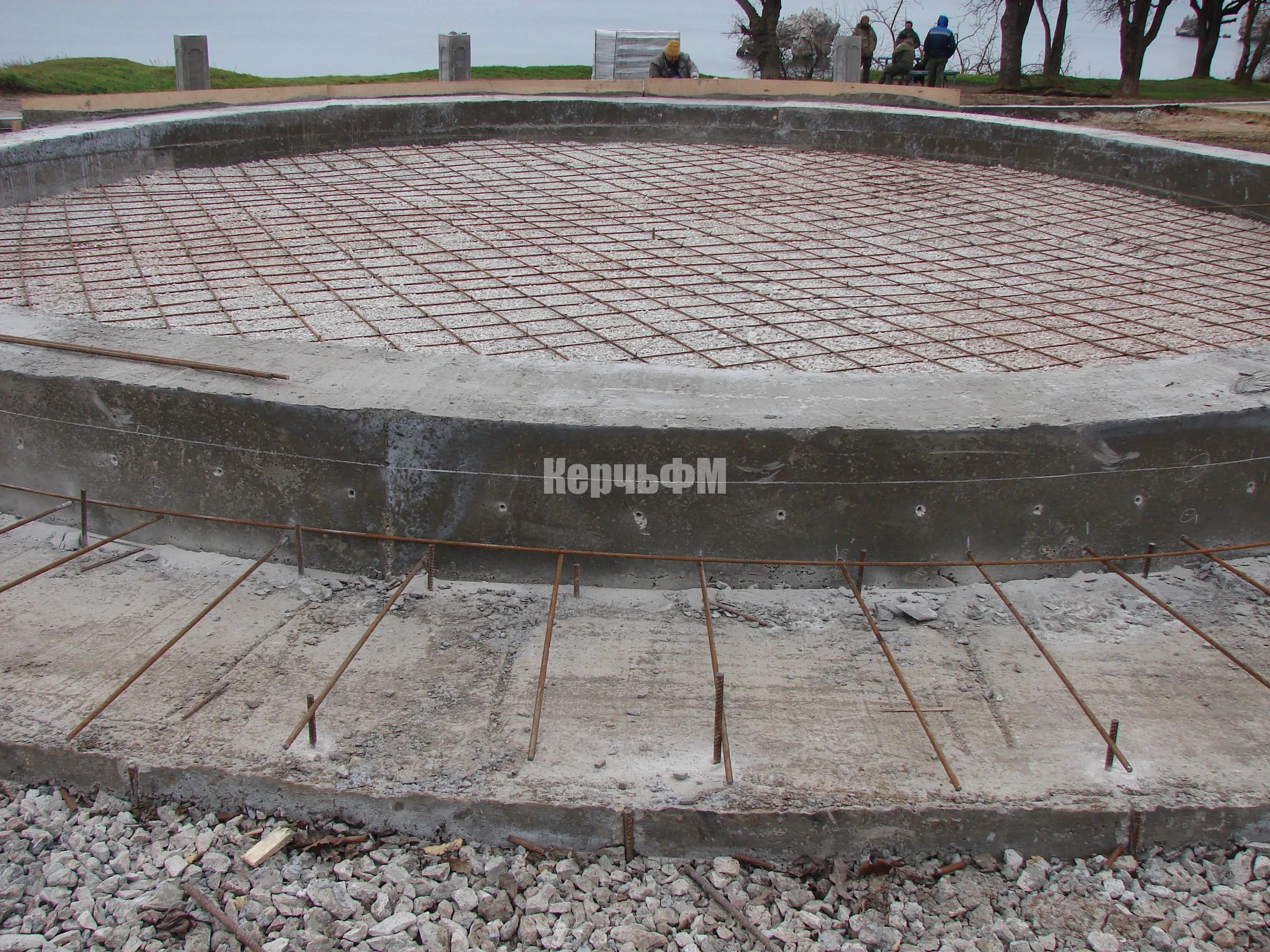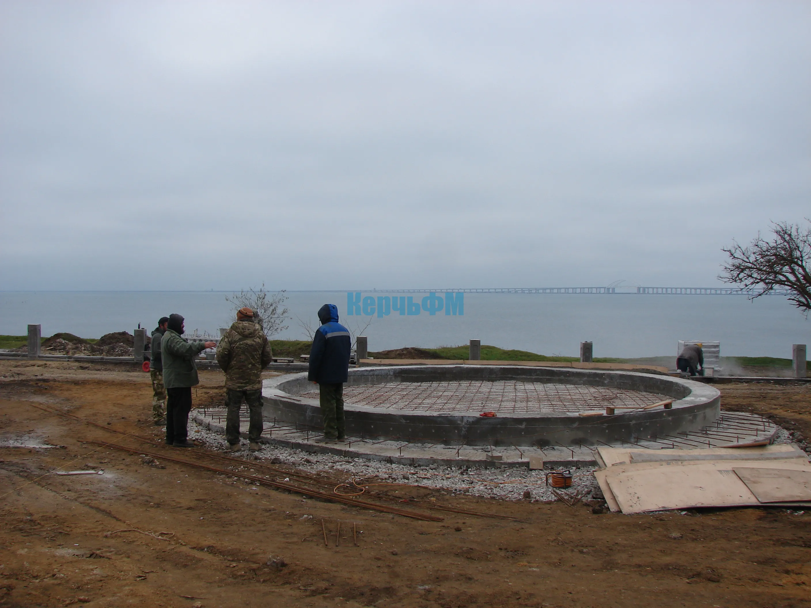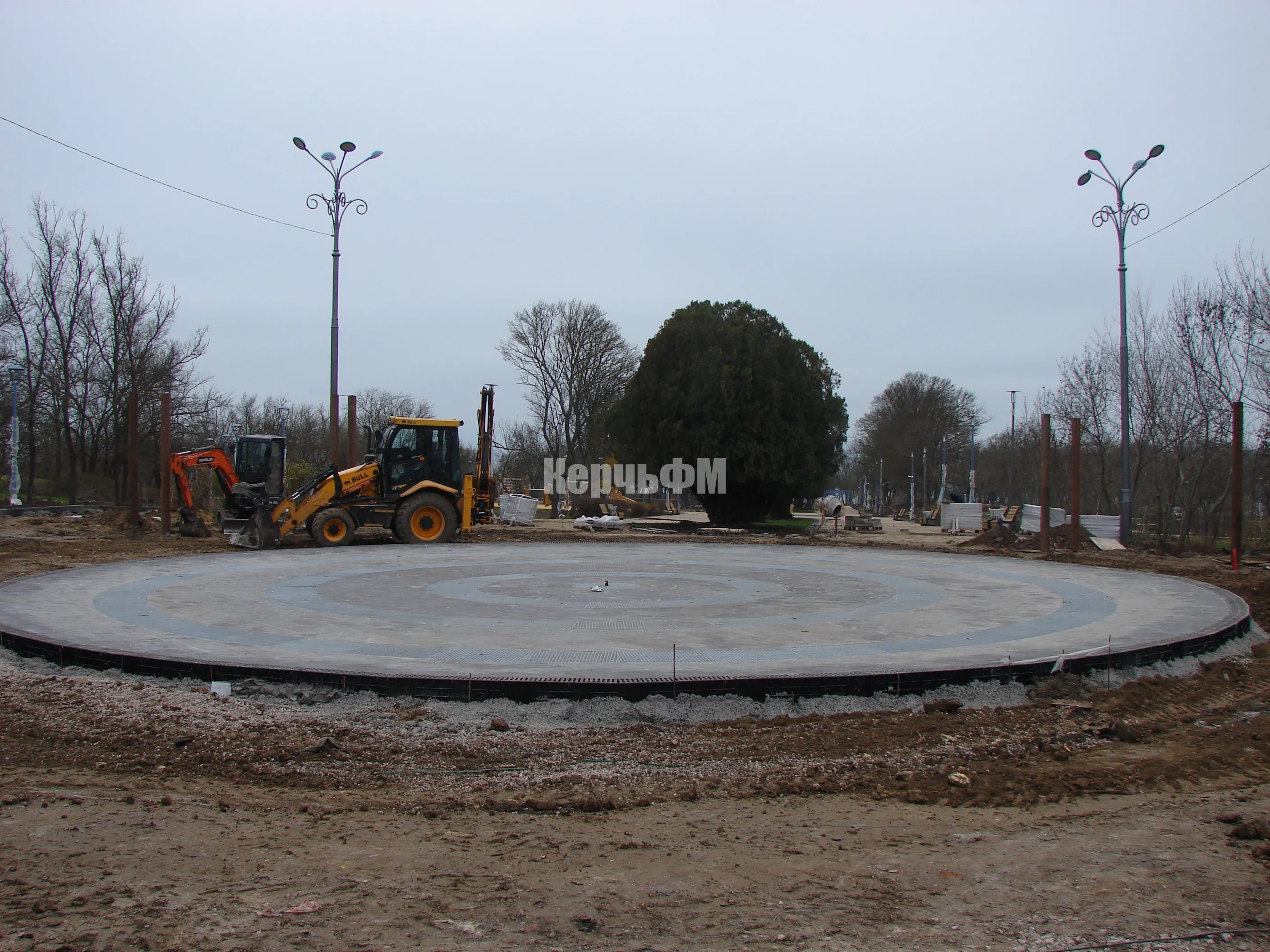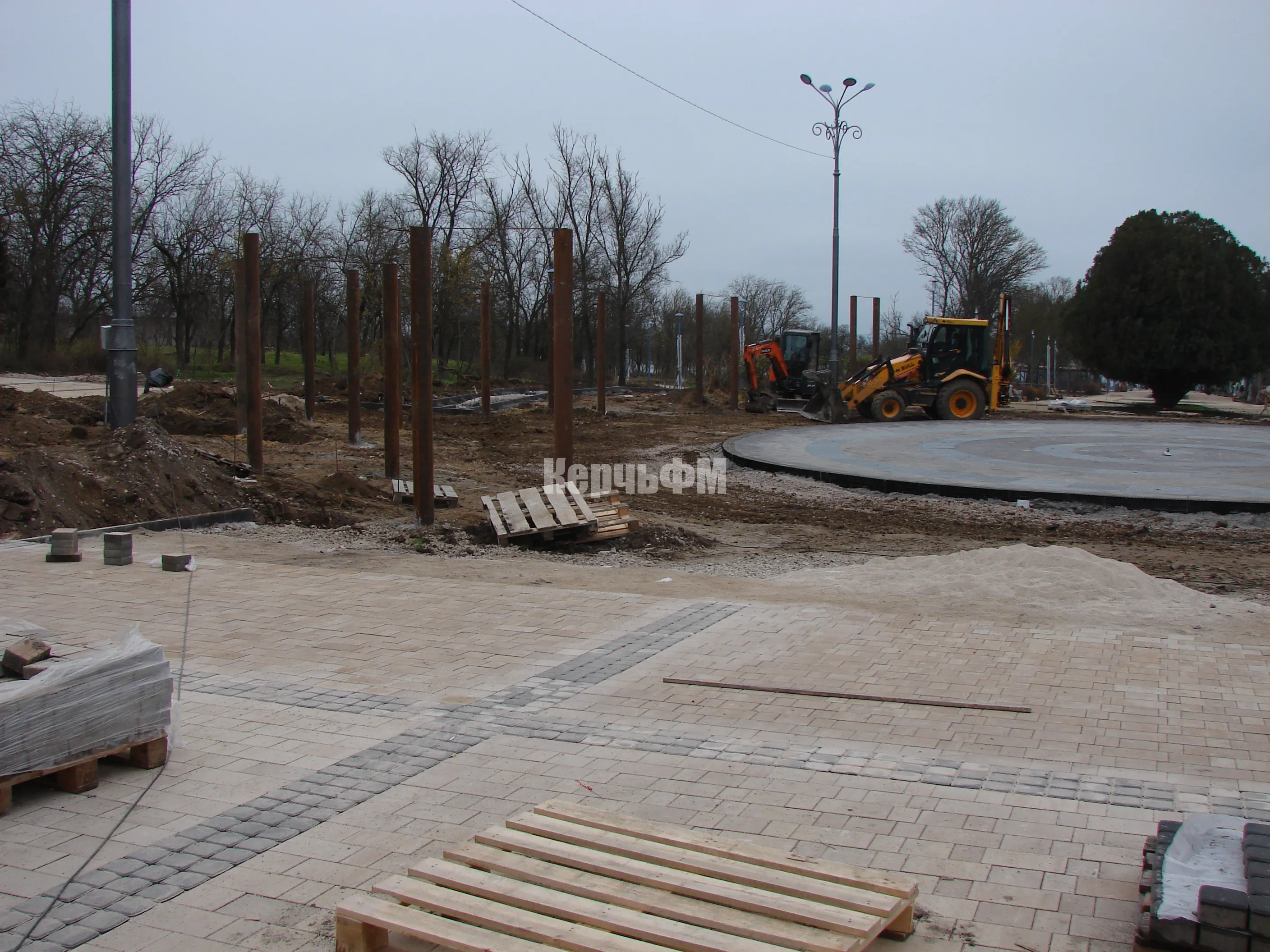 В конце главной аллеи монтируется сцена, а также над морем ведется установка бетонных элементов ограждения в виде фигурных столбиков, передает КерчьФМ.