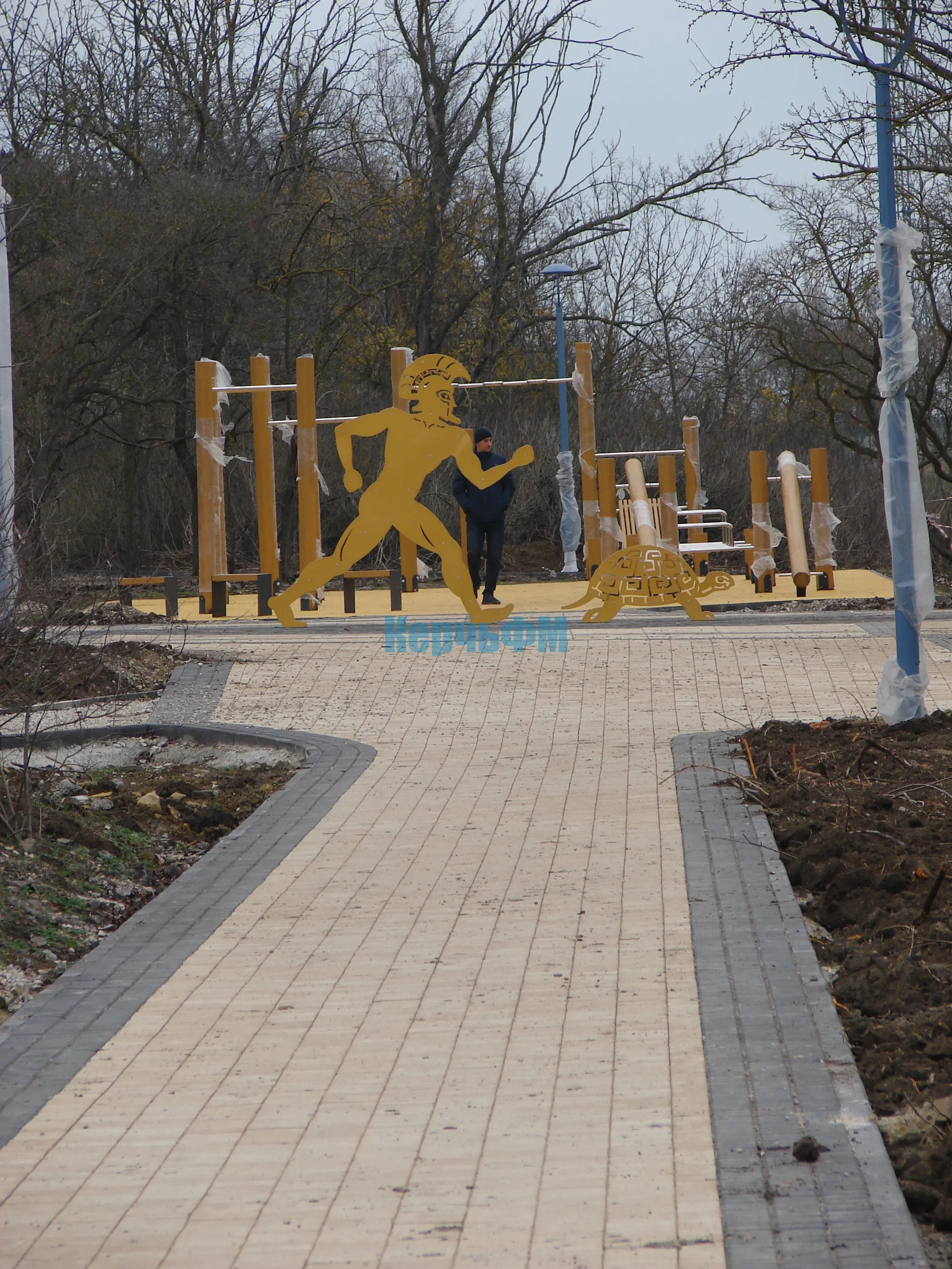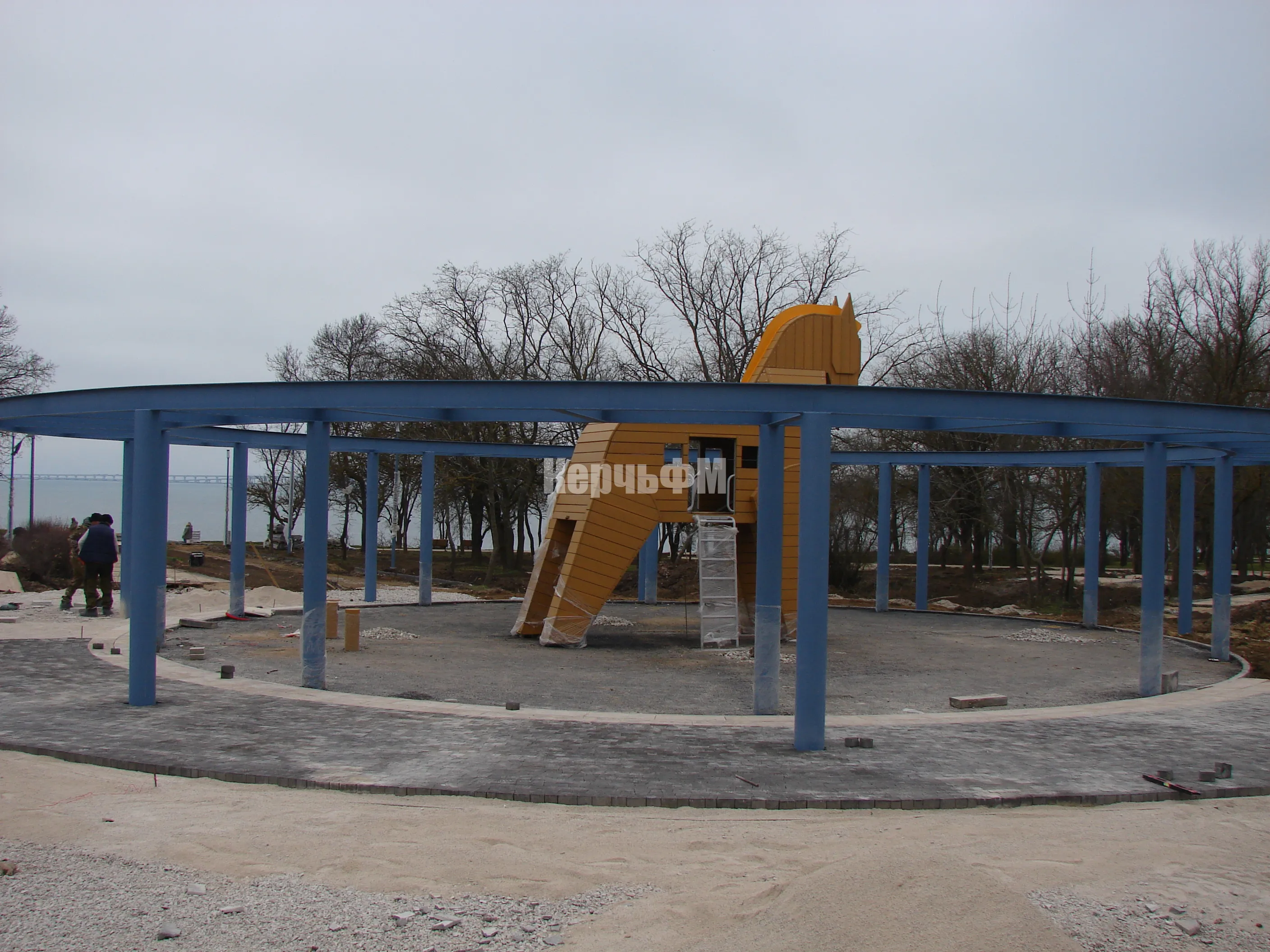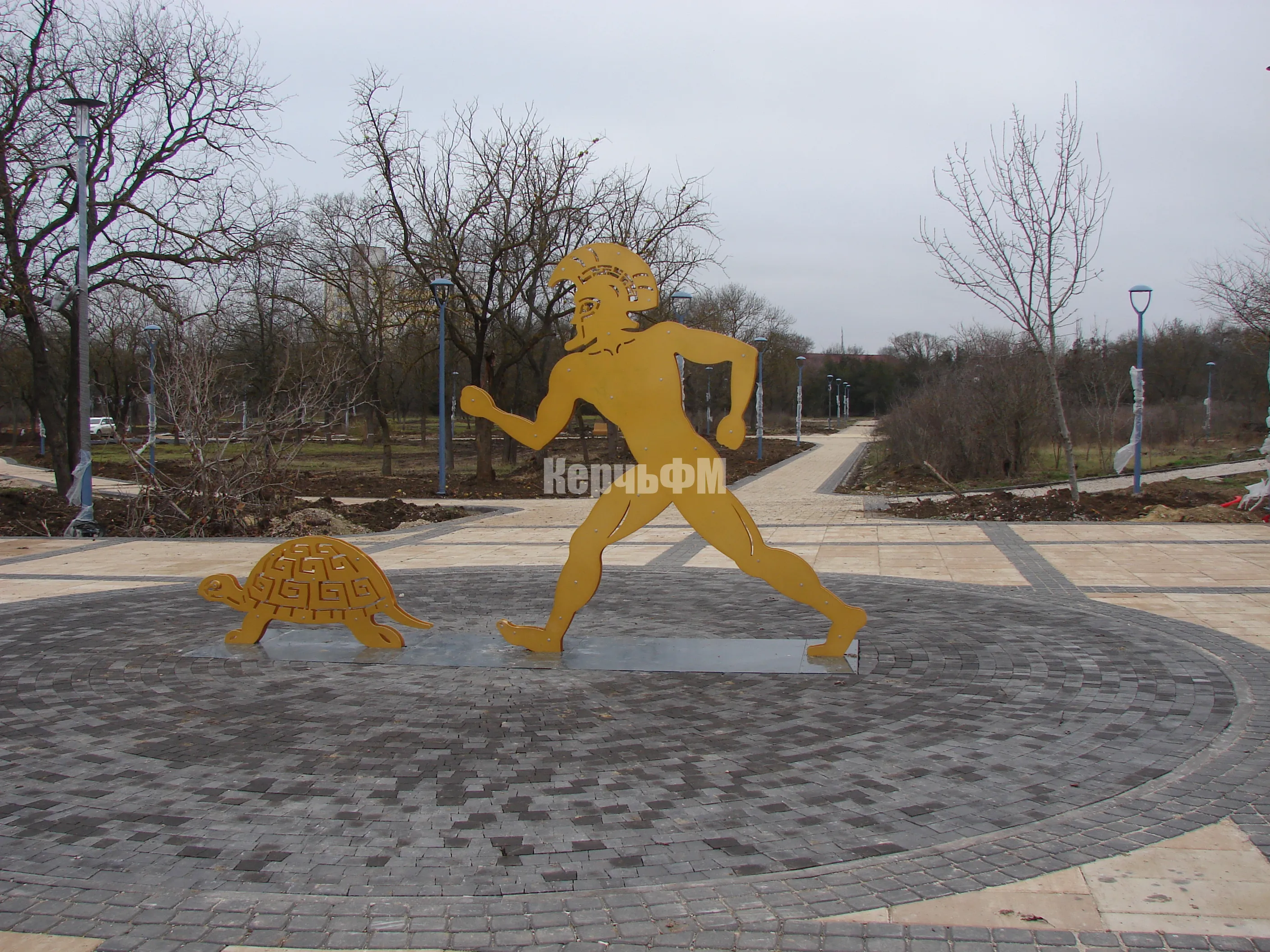 Завершается мощение прогулочных аллей, которые уже украшают арт-объекты - «Троянский конь», «Стрела Париса», «Ахиллес и черепаха».