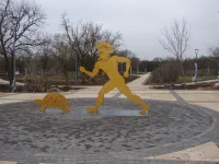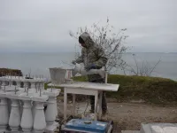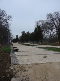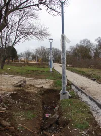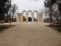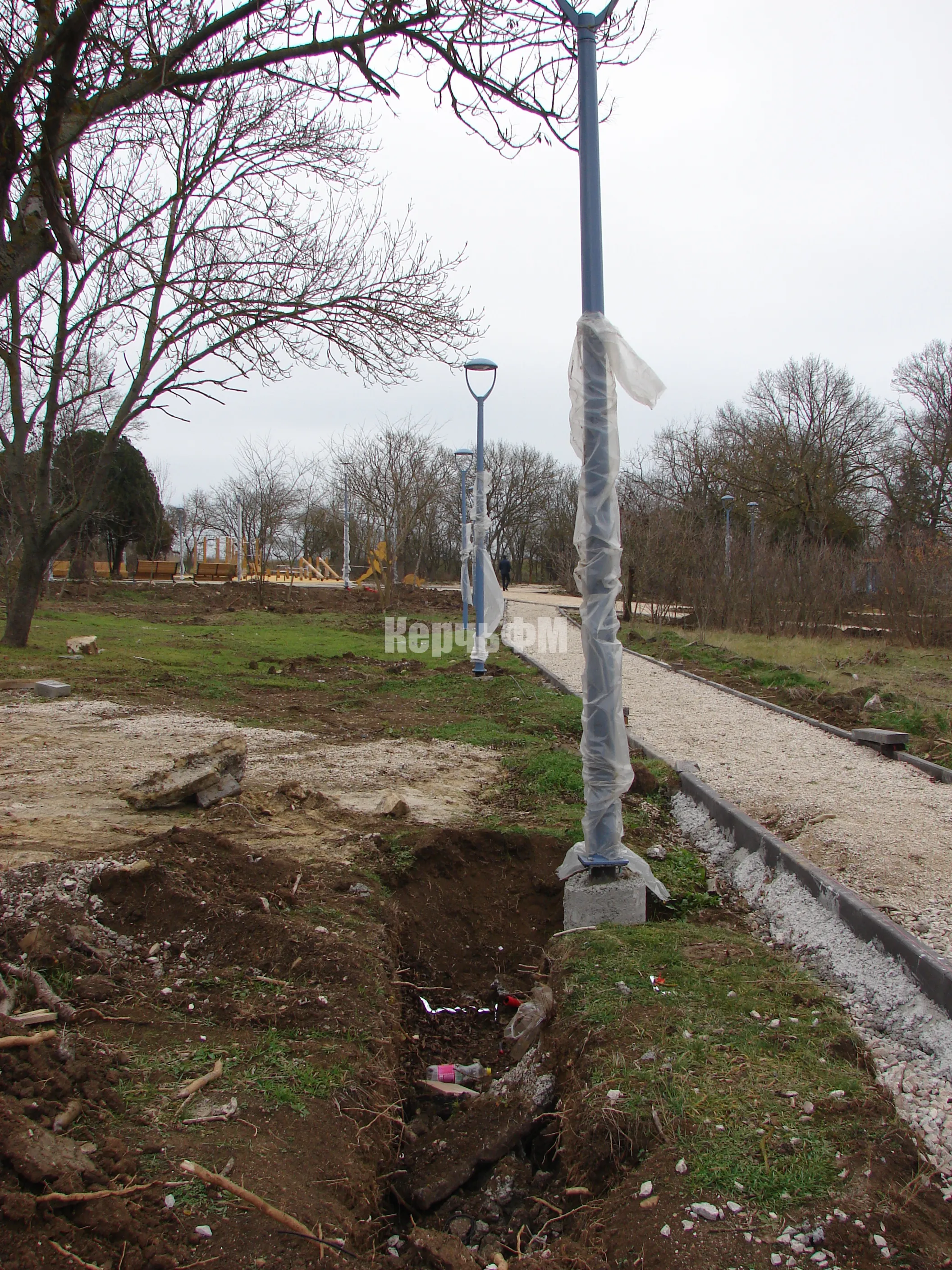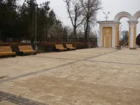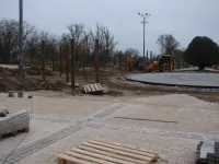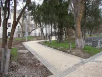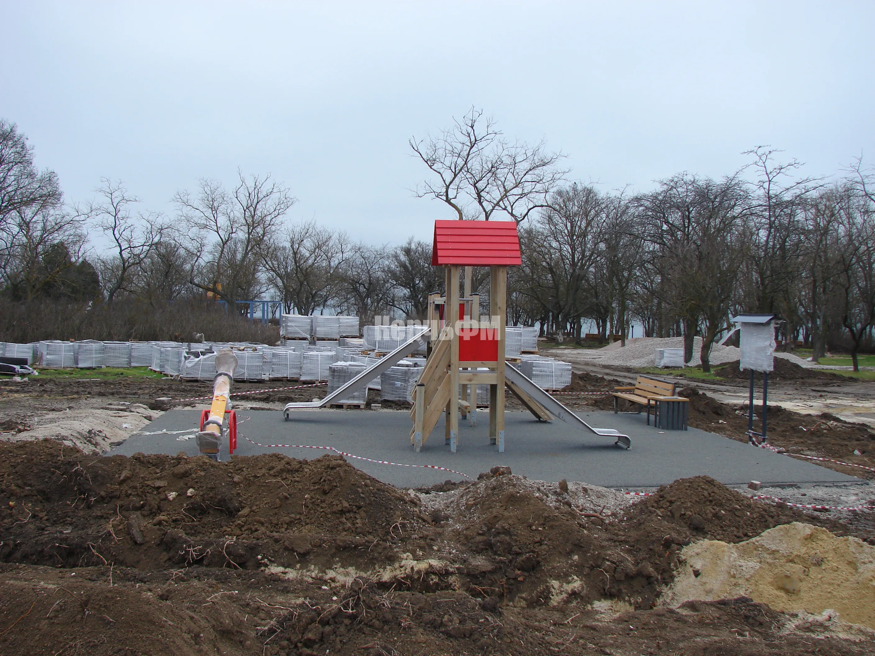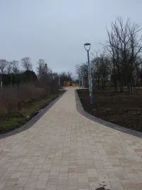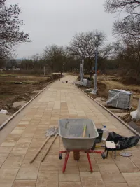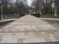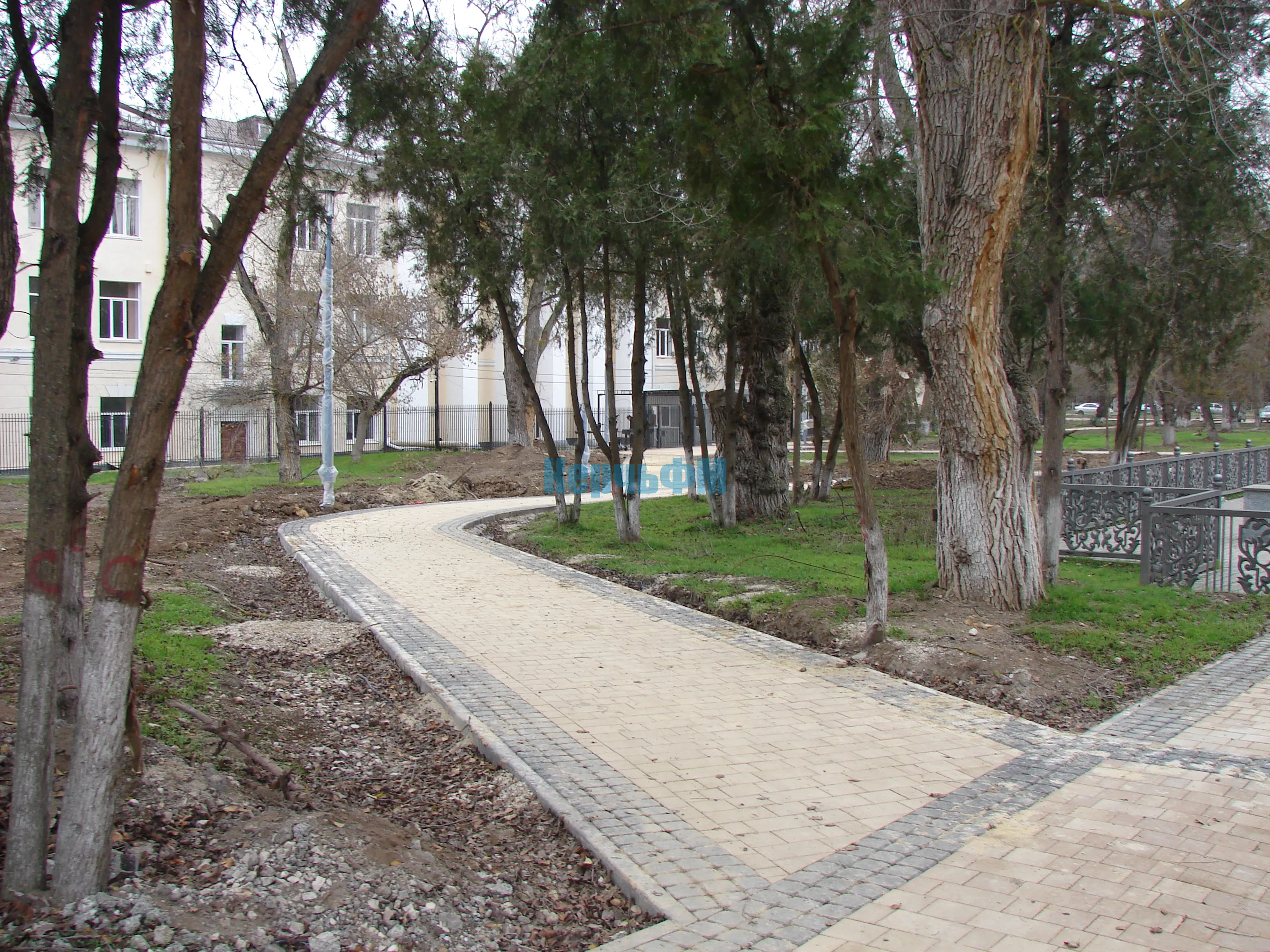 Завершается мощение прогулочных аллей, которые уже украшают арт-объекты - «Троянский конь», «Стрела Париса», «Ахиллес и черепаха».