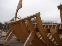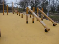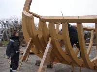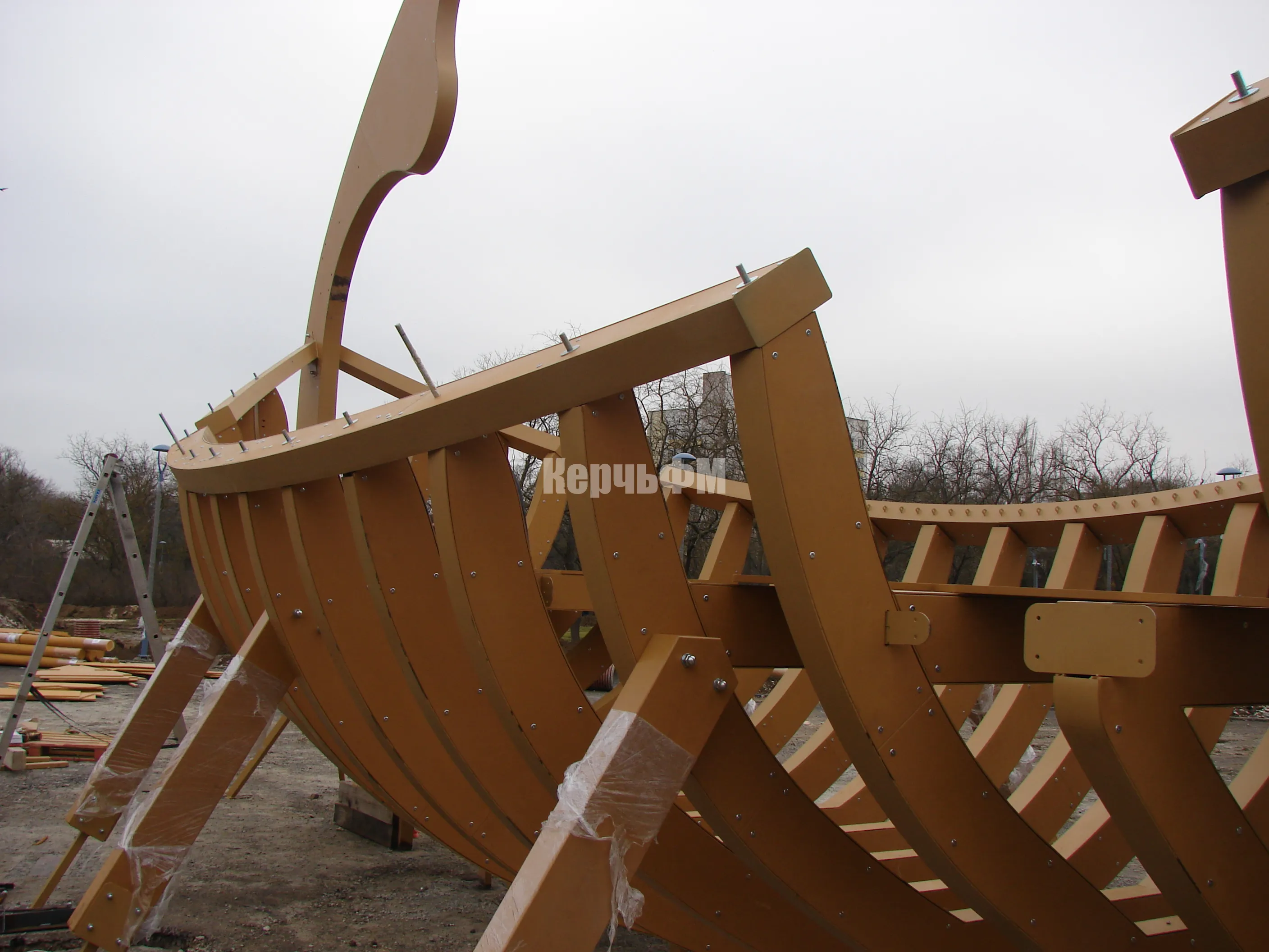Справа от центральной аллеи завершается установка деревянной ладьи на детской площадке.