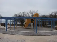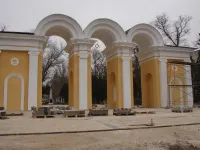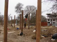 Если идти от главного входа, то сегодня можно увидеть следующие преобразования: вокруг фонтана, строительство которого было завершено на прошлой неделе, рабочие устанавливают опоры для пергол.