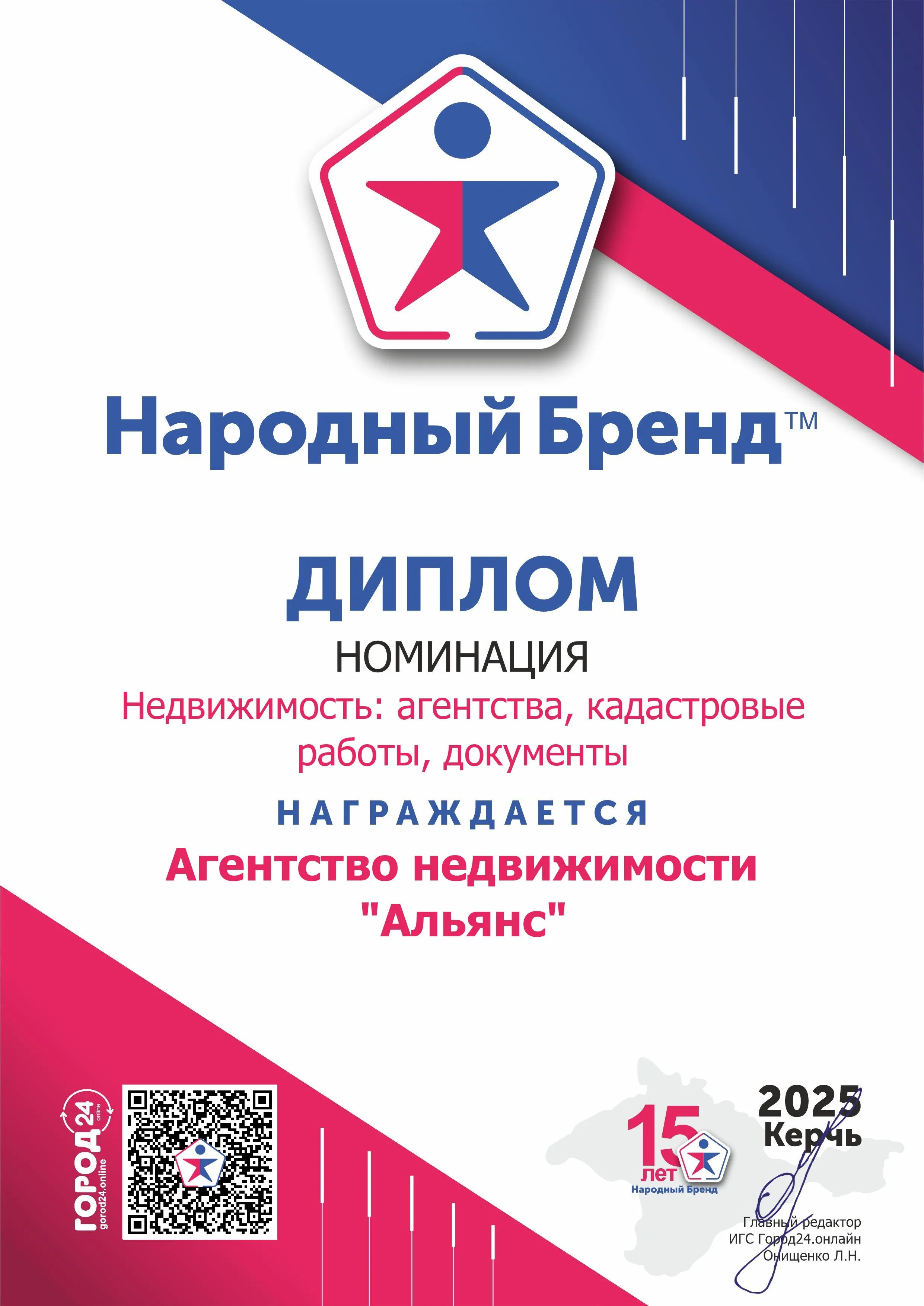 В поисках надежного проводника в области законодательства мы стремимся найти настоящего профессионала. Так методом народного голосования победителем престижного конкурса “Народный Бренд-2025” становится Керченское агентство недвижимости "Альянс".
