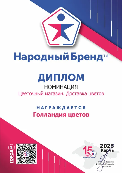 По результатам народного голосования, мастерская "Голландия Цветы" города Керчи удостоена звания победителя конкурса Народный Бренд-2025”!