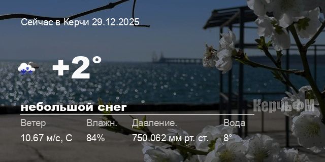 Сегодня днем в Керчи, 29 декабря, ожидается снегопад, температура воздуха от +0.5° до +2°С, ветер северный 10.79 м/с, порывы до 11.14 м/с, давление 750.8 мм рт. ст., влажность 80%.