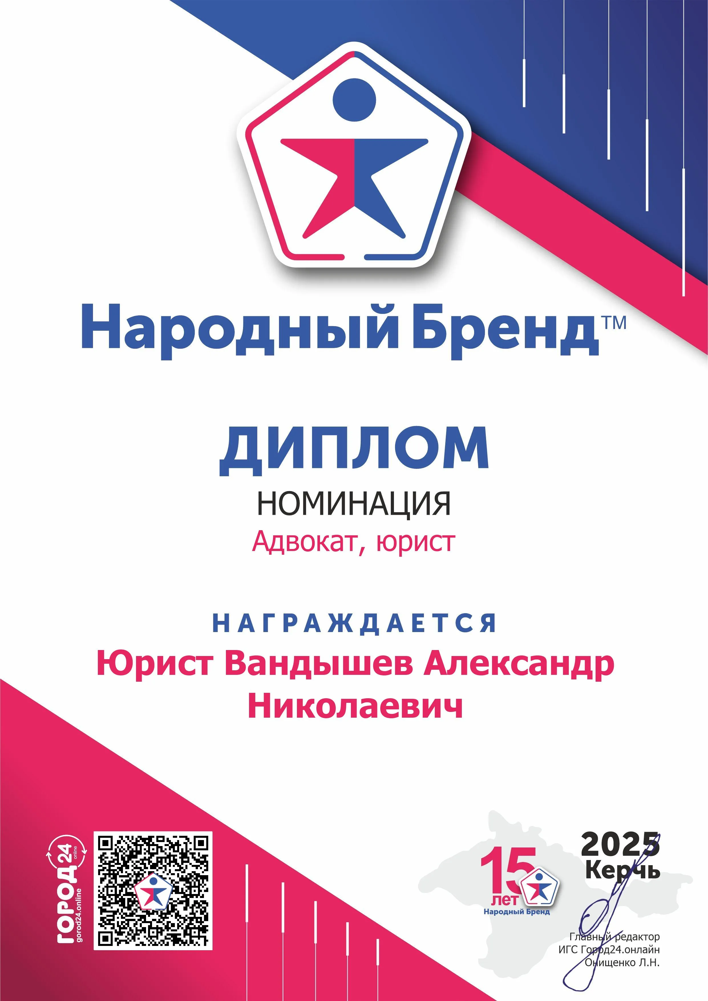 В мире, где юридические вопросы могут стать настоящим испытанием, наличие надежного и компетентного защитника - бесценно. Именно поэтому победа Александра Николаевича Вандышева в конкурсе "Народный Бренд-2025" в номинации "Адвокат, юрист" стала закономерным признанием его профессионализма и высокого уровня доверия со стороны клиентов. Эта награда - не просто формальность, а подтверждение того, что Александр Николаевич действительно является тем, кто способен от консультации довести до успешного решения Вашего самого сложного юридического вопроса.