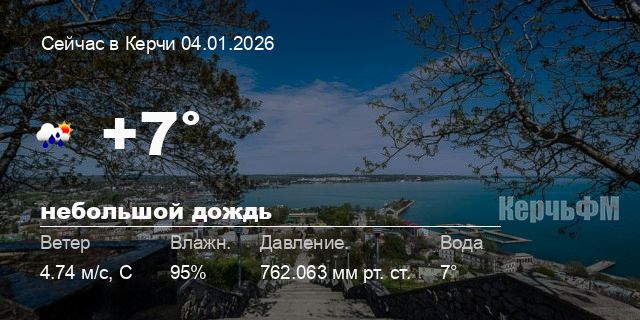Сегодня днем в Керчи, 04 января, ожидается небольшой дождь, температура воздуха от +6.3° до +10.9°С, ветер северный 13.16 м/с, порывы до 11.29 м/с, давление 761.3 мм рт. ст., влажность 93%.