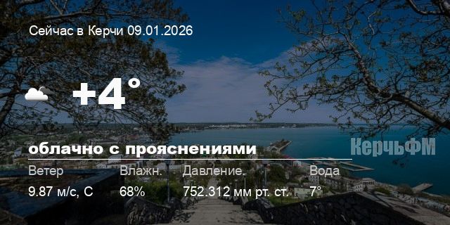 Сегодня днем в Керчи, 09 января, ожидается малооблачная погода, температура воздуха от +3.1° до +10.6°С, ветер северный 7.74 м/с, порывы до 14.47 м/с, давление 754.6 мм рт. ст., влажность 58%.