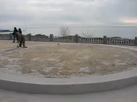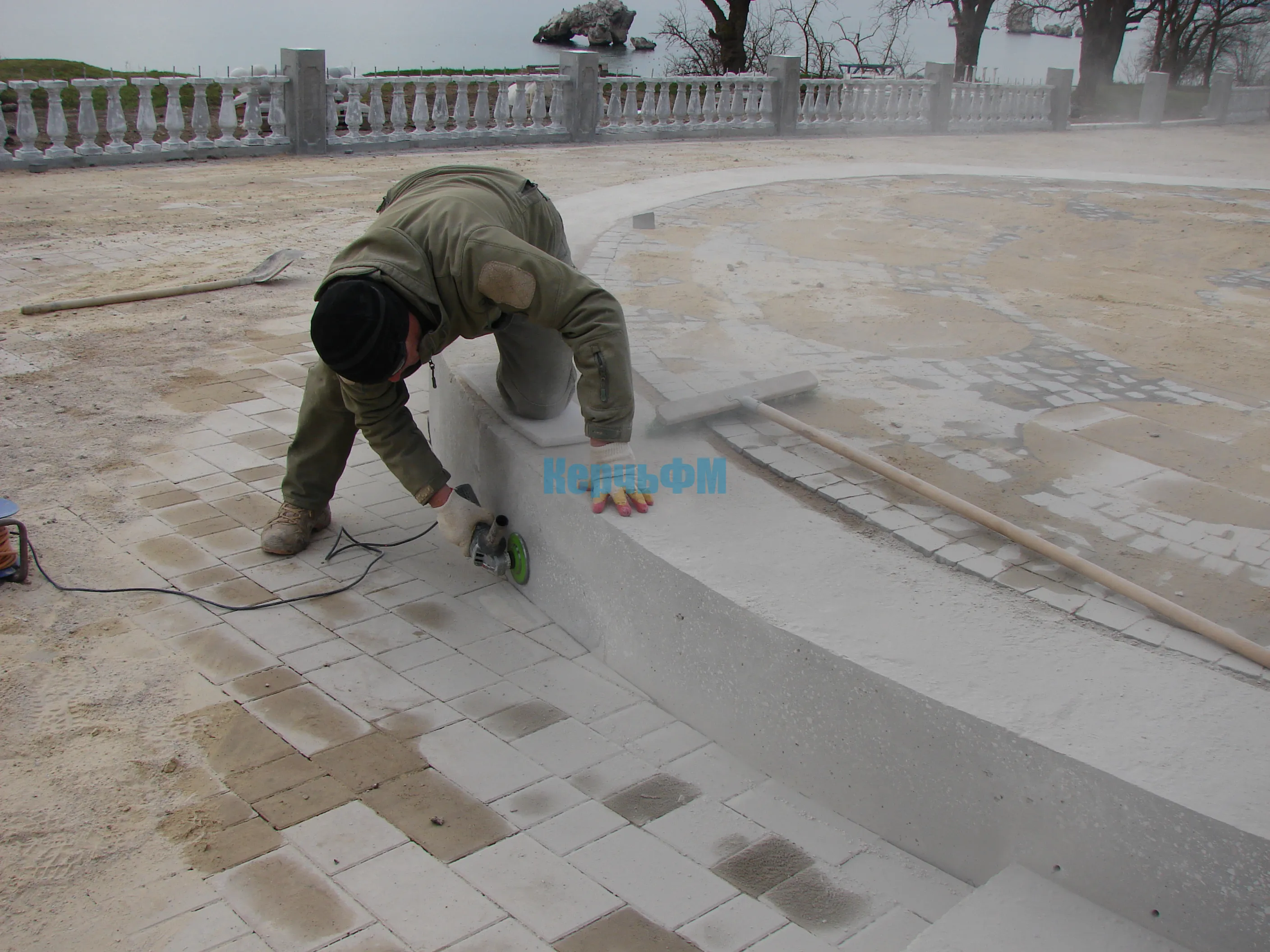 Укладка плитки на центральной аллее ведется на подходе к сцене, сделанной в ее конце, откуда открывается на море прекрасный вид.