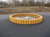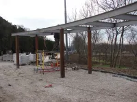Сразу за центральным входом и под перголами, установленными вокруг фонтана, уложена тротуарная плитка.