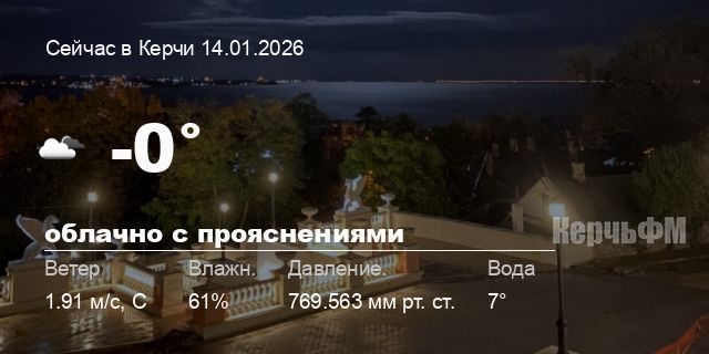Сегодня днем в Керчи, 14 января, ожидается малооблачная погода, температура воздуха от -0.8° до +1.8°С, ветер северный 0.56 м/с, порывы до 4.26 м/с, давление 768.8 мм рт. ст., влажность 56%.