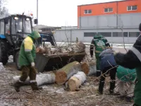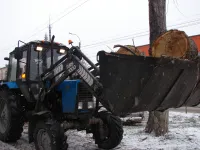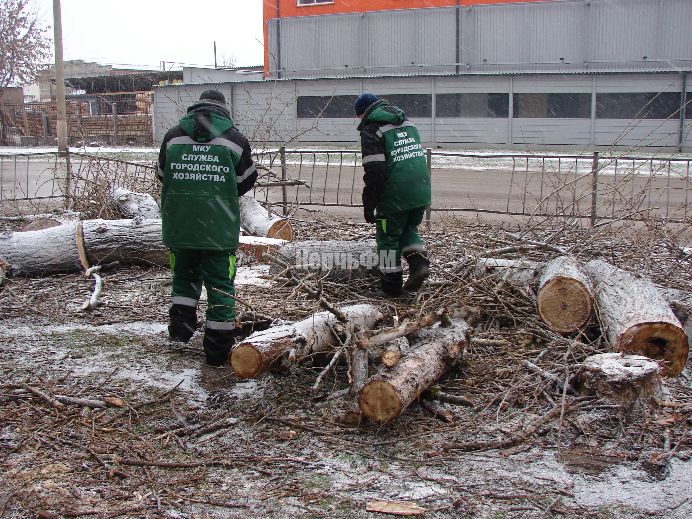 Специалисты Службы городского хозяйства проводили сегодня спил аварийных высоких тополей, растущих вдоль Вокзального шоссе у дома № 35.